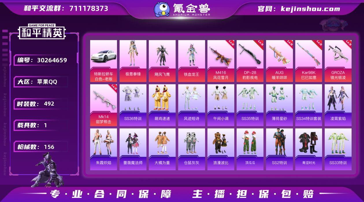 实名: 可修改 时装数: 492 载具数: 1 枪械数: 156 战备数: 118 热门装扮: 浪漫波比,飓风飞鹰,铁血龙王,仓鼠灰灰,大橘为重,蔷薇魔法师,极意拳锋 载具: 特斯拉Model 3(珍珠白) 稀有枪皮: M416风花雪月,GROZA-镜光银凌,Kar98K-巳巳如意,AUG-暖羊咩咩,MK14-甜梦熊击,DP-28-豹影疾电