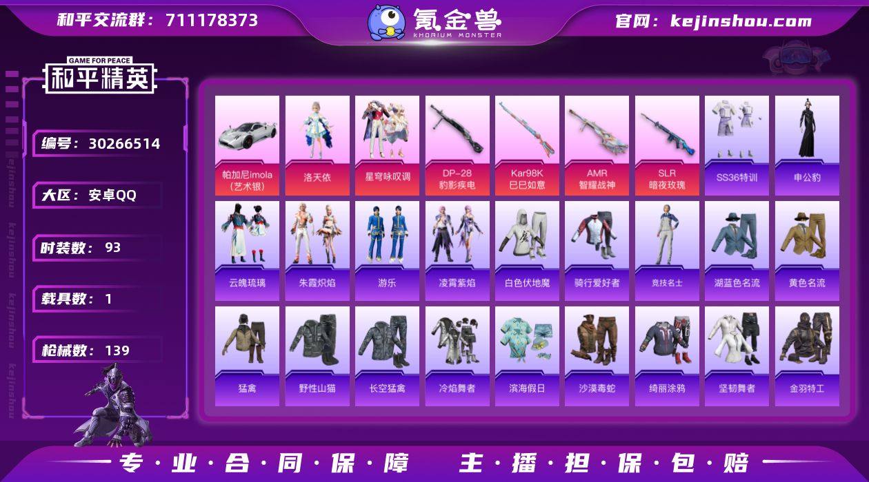【1载具 4特效枪 2粉装 139枪皮 93套装】14印记/4.1万热力值/50级收藏家/有洛天依,老六服,美羊羊/套装-沙漠毒蛇,套装-雪山精英,角色-洛天依,套装-老实芭蕉,套装-星穹咏叹调/4升级枪:Kar98K-巳巳如意,AMR-智耀战神,SLR-暗夜玫瑰,DP-28-豹影疾电/1载具:帕加尼imola(艺术银)/2飞行器:齐天大圣飞行器,异域银装飞行器190783492x,编号:LYATD55