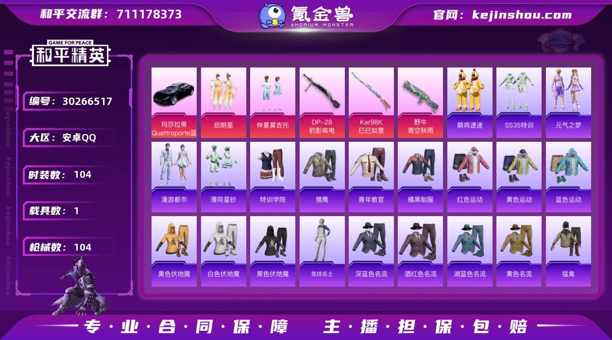【1载具 3特效枪 2粉装 104枪皮 104套装】王者连体号/6印记/3.1万热力值/39级收藏家/套装-启明星,套装-仲夏莫吉托,套装-老实芭蕉/3升级枪:Kar98K-巳巳如意,野牛-青空秋雨,DP-28-豹影疾电/1载具:玛莎拉蒂Quattroporte(夜幕蓝)/1飞行器:启明星飞行器190270492x,编号:LYQCE25