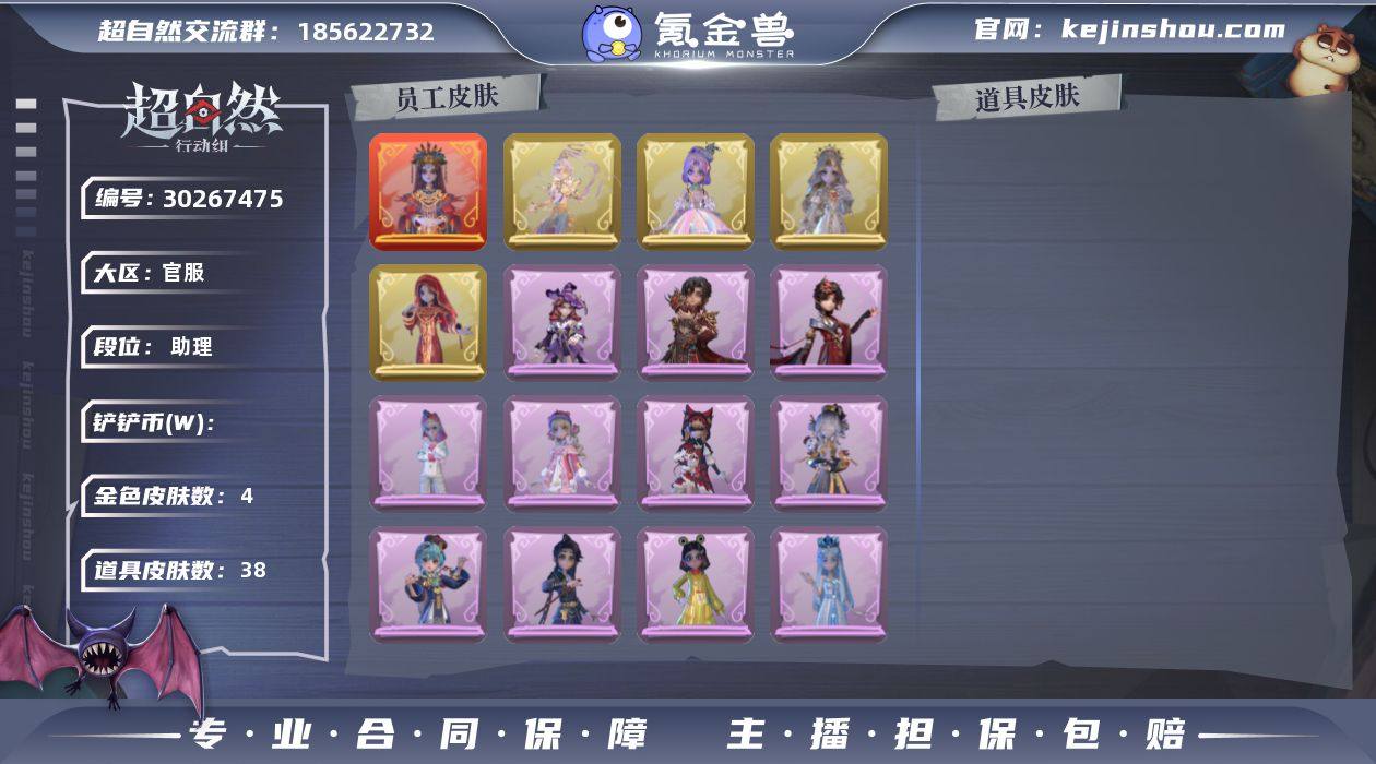 PB67 【段位】超自然传说 【幻梦皮肤数量】1 【金色皮肤数量】4 【紫色皮肤数量】17 【道具皮肤数量】38 【【累充】39180金砖 【赛季魔盒】稀世豪华魔盒 【员工】小黄、爱丽丝、零、阿念、逍遥、薇薇安、巫铃儿、莉莉、艾伦、爱德华、兰 【幻梦皮肤】巫铃儿-镜生遗梦 【金色皮肤】逍遥-莲华渡、薇薇安-圣光之谕、小黄-遗失的童话、巫铃儿-镜花辞 【紫色皮肤】兰-千夜星谕、零-搬开山、薇薇安-仙锋小姐、爱丽丝-甜梦派对、艾伦-绒绒对决、莉莉-莓果陷阱、阿念-迷途僵宝、莉莉-除妖小师妹、莉莉-情公主、艾伦-水王子、爱丽丝-冰公主、小黄-罗丽、薇薇安-白光莹、零-青云逸歌、爱丽丝-丝缕哀歌、逍遥-绣春逍影、小黄-呱呱雨衣 【道具皮肤】喷气背包-晶澜灵翼、专业手电-云端梦想计划、黄牛能量饮料-青玉抱丹、刺刀-紫气东来、长鞭-小狗蛇点点鞭、铲子-圣心之泪、桃木剑-最后的独角兽、桃木剑-凤鸣九天、除颤仪-弦外之音、腰包-月下莲台、腰包-惊魂娃娃、腰包-宝剑八、黄牛能量饮料-珍珠芭乐莓莓、铲子-龙鳞、喷气背包-乘风溯雪、摸金符-祝祷词、刺刀-碧络琅环、铲子-赞萌波板糖、传送按钮-昆仑镜、传送按钮-幻宠之门、葫芦-伏妖塔、额外的背包-飞花令、转轮手枪-新星时代、铲子-卡皮巴拉小黄豚铲、夜视仪-心跳眼镜、夜视仪-金丝眼镜、摸金符-紫霄、急救包-蔷薇物语、摸金符-花落精绝、音响-happy猫、短管猎枪-赞萌露比水枪、长鞭-飞天绫、音响-鸣沙鼓、电击枪-甜蜜泡泡枪、背饰-潮汐小海兔、背饰-梵音莲华、背饰-天使的呼唤、背饰-蝶恋花 【美妆】暗夜小恶魔 【载具】惊奇万圣涂装 【头饰】樱桃奶油布丁、惊魂南瓜头套、精致露比头套、小财神豚豚头套、鱼头怪头套、烈焰红唇头套、大葱明头套、火爆了头套、面具马头套、哈士奇头套、萨卡班甲鱼头套、嘻嘻头套、滑稽头套、呆滞头套、卑微头套、小狗蛇点点头套、像素朋...