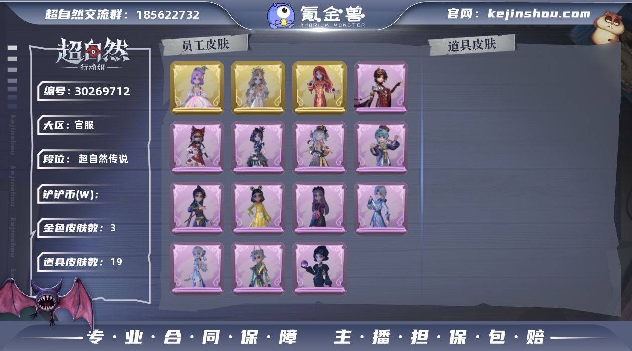 PB83 【段位】超自然传说 【金色皮肤数量】3 【紫色皮肤数量】14 【道具皮肤数量】19【累充】15580金砖 【赛季魔盒】稀世豪华魔盒 【员工】小黄、爱丽丝、零、阿念、逍遥、薇薇安、巫铃儿、莉莉、艾伦、爱德华、兰 【金色皮肤】薇薇安-圣光之谕、小黄-遗失的童话、巫铃儿-镜花辞 【紫色皮肤】薇薇安-仙锋小姐、莉莉-莓果陷阱、小黄-异色序曲、阿念-迷途僵宝、莉莉-除妖小师妹、薇薇安-黑月挽歌、爱丽丝-冰公主、薇薇安-白光莹、逍遥-泽引山海、零-青云逸歌、巫铃儿-素影瑶光、爱丽丝-丝缕哀歌、逍遥-绣春逍影、小黄-呱呱雨衣 【道具皮肤】铲子-龙鳞、转轮手枪-新星时代、音响-happy猫、夜视仪-金丝眼镜、传送按钮-昆仑镜、桃木剑-永眠曲、长鞭-小狗蛇点点鞭、刺刀-碧络琅环、长鞭-飞天绫、音响-鸣沙鼓、喷气背包-乘风溯雪、腰包-绯红柴郡猫、摸金符-花落精绝、急救包-蔷薇物语、黄牛能量饮料-青玉抱丹、背饰-潮汐小海兔、背饰-云梦之星、背饰-蝶恋花、背饰-在逃小新娘 【头饰】樱桃奶油布丁、惊魂南瓜头套、鱼头怪头套、烈焰红唇头套、大葱明头套、火爆了头套、面具马头套、哈士奇头套、萨卡班甲鱼头套、嘻嘻头套、滑稽头套、呆滞头套、卑微头套、鳄霸天头套、驼半仙头套、炙热烧烤、粽小宝头套、像素朋克墨镜、后室幸存者头套 【挂饰】九色祥鹿、小小玛丽、未竟乐园、钗头凤、糖果守卫 【动作】luvaboy、鸳鸯戏、舞台中心、山楂树之舞、带你逃跑吧、举牌、抬手、KT猫摇