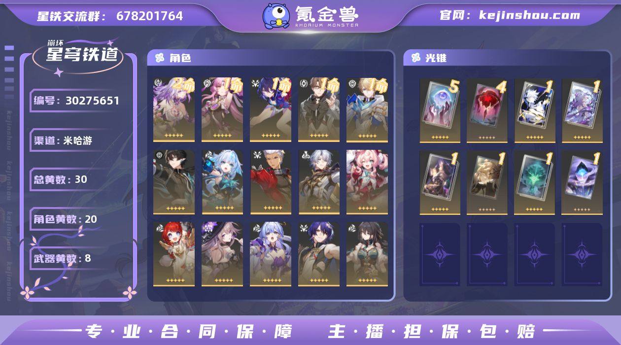 2+1遐蝶 提宝 ,风堇,0+1白厄+刻葎,练度还可以,三深渊满星配置 角色池还有个大保底,武器池垫了40~50,后期配队随便补,邮箱完全不用担心,即见即所得
