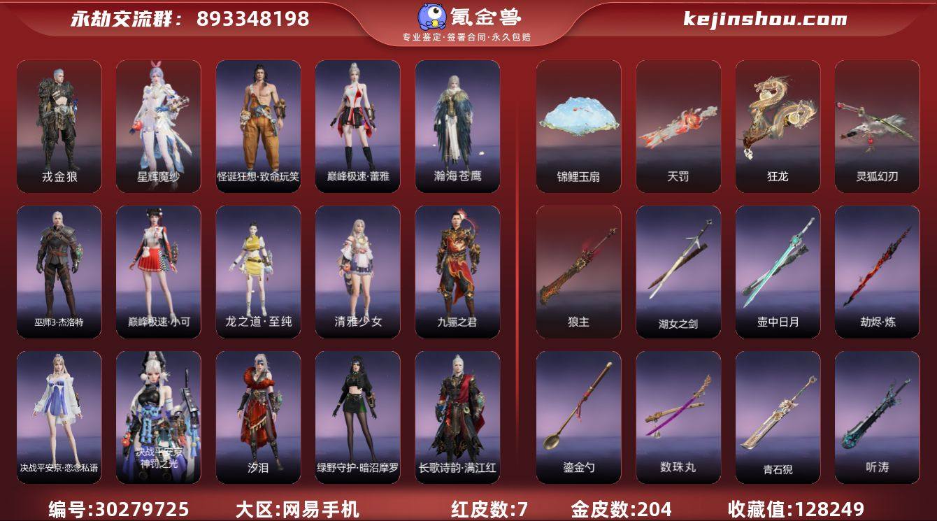 7红204金|等级222|收藏值128249|蚀月|幻丝38061|金砖20|通行证Lv.55 红色神品:星辉魔纱,戎金狼,天罚,灵狐幻刃,狼主,锦鲤玉扇,狂龙 角色金色皮肤:P5R·奥村春NOIR,云溪仙子,绿野守护·悠竹萌客,九骊之君,智绘·萍之缘,观山海·春神句芒,怪诞狂想·致命玩笑,巫师3·杰洛特,巅峰极速·小可,龙之道·至纯,清雅少女,决战平安京·恋念私语,决战平安京·神罚之光,妖刀姬,汐泪,绿野守护·暗沼摩罗,长歌诗韵·满江红,2674·争斗洪流,百战·破荆者,龙之影·过江龙,封神录·申公豹,春日序曲·寒芷,禄运玉霄,赤丹朱湛,麟鹿大铠,花之倾奇,巅峰极速·蕾雅,瀚海苍鹰,福瑞天泽,炽火照夜,云间影,绿野守护·山漠狞影,古冢行,雪铃绮歌 发型金色皮肤:(挑染)泠川发,(挑染)云霞发,绿野守护·娇憨发,P5R·NOIR发型发,逆水寒·江海发,巫师3·白狼发,绿野守护·冷傲发,长歌诗韵·壮怀发,绯霜发,幽焰发,惊雀发,秀逸发,鹤姿发,蜜语发,虹猫蓝兔七侠传·蓝发 武器金色皮肤:戏祥云,绿野守护·雨幕,萤火,天心玉,雪国礼炮,竹霹雳,龙啸,丹鹤,月虹弦角,乌木弓,狻猊吼,不良人·华阳针,无相印,绿野守护·毛乎乎,巫师3·湖女之剑,劫烬·炼,壶中日月,鎏金勺,数珠丸,雷厉,白鹿,青石猊,听涛,护云狩,长虹,建木,糖果棍,打狗棒,判官笔,仙舞,华夏神兵·马首刀,青峰叠扇,墨绒羽扇,腾云歌,耀夜流华,傲骨,嘶风,九霄寒,玉矩,精武,空寒,蛋仔派对·咸鱼,破重云 饰品金色皮肤:玄陶俑面·女,美团·团上头了,P5R·NOIR的帽子,绿野守护·绒绒猫,希希,炎流云禅笠,玄陶俑面·男,魔烛帽,巫师3·驴耳朵,福虎帽,巅峰极速·车队帽,2674·游隼,青龙盔,则元冠,虎绒耳,倾国倾城·名花,乌金带,虹猫蓝兔七侠传·虹光,虹猫蓝兔七侠传·长风,安乐冠,金瑛冠,盗墓笔记·防风帽,鹿铃角,羽之华,虹猫蓝兔七侠传·寒月 【代币或期限道具请以实际验号为准】【网易国服】【手机账号】