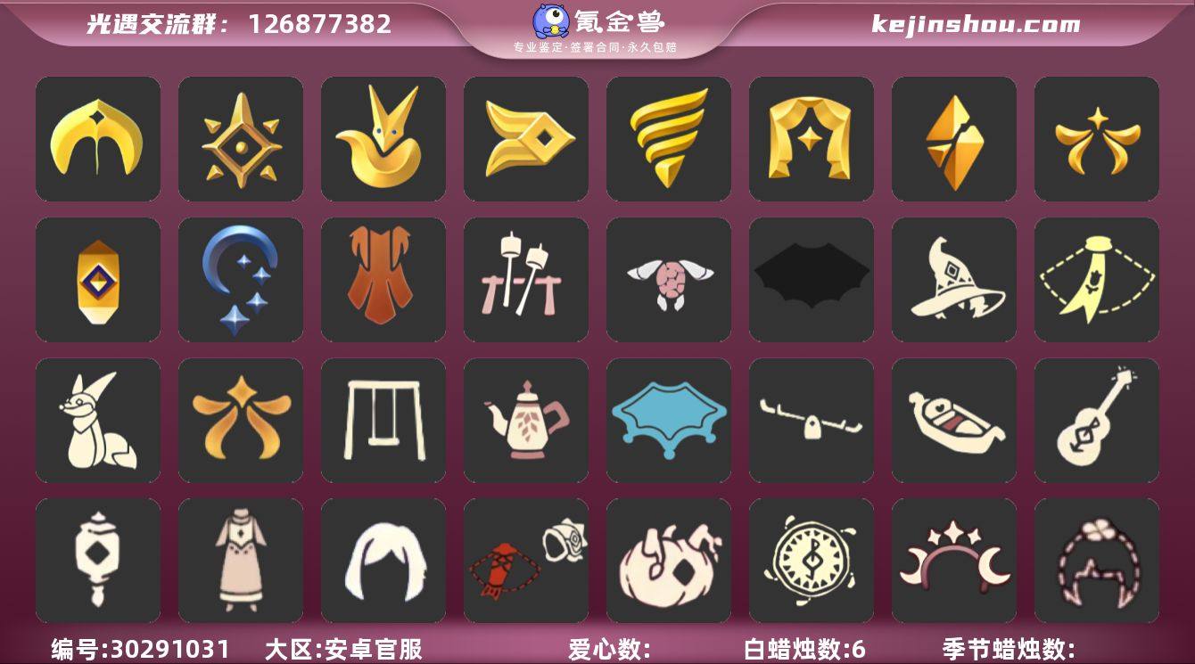 蜡烛数:212/爱心数:309/晨岛/云野/雨林/霞谷/墓土/禁阁/魔法季/圣岛季/预言季/梦想季/集结季/小王子季/风行季/潜海季/表演季/破晓季/欧若拉季/追忆季/夜行季/拾光季/归巢季/九色鹿季/双边耳坠/手碟/鳐鲲斗篷/阿努比斯(狗头)/凤凰面具/凤凰斗篷/胜利号角/连帽斗篷/小王子发型/小王子套装/玫瑰花/风行毛领/蓝黄羽袖/单边小辫/黄眉企鹅面具/燕尾斗篷/冥龙斗篷/留辫蘑菇头/高领舞服/透明蝶翼斗/肩带/追忆之书/棕熊面具/绒毛斗篷/西部帽/粗框眼镜/季卡相机/五塑彩羽发/五塑彩带斗/九色鹿丸子头/九色鹿丝带裤/九色鹿飞天斗篷/水母/夏日有友礼包/绒帽/彩虹帽/巫师/鲤鱼套/星月头饰/巫树犄角/圣诞鹿角/南瓜/彩虹耳机/星球夹克/欧若拉之翼/奉献斗篷/年年有鱼礼包/海龟斗篷/蝙蝠套/蛛网斗篷/瑞雪/白雪斗篷/粽叶斗篷礼包/雏鸟之琴/音韵吉他/欧若拉之声/灯笼/夏日阳伞/花憩茶桌/小憩茶桌/小狐狸/冥龙南瓜/武士裤/背带裤/搓澡巾/击剑裤/虚荣/花环/红耳机/若笠/平顶帽/白金斗篷/黑金斗篷/红金斗篷/雨伞/高音钢琴/星星面具/黄鼠狼/魔法季耳坠/星月头冠/水母肩饰/猫猫头/归巢毕业发型/花环长发/帝企鹅发/多羽发饰/贝壳发饰/玉兔发饰/雪花发夹/创始人斗篷/小王子围巾/雪花水晶球/情人小船/毕业手碟/情人跷跷板/情人秋千/中秋灯笼/凯旋手碟