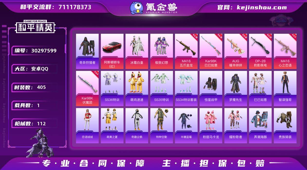 【2粉装6特效枪1载具五爪金龙5级奇异狩猎者】 安卓Q区-32015热力值--87套装-112枪皮 【1稀有】奇异狩猎者【1载具】 阿斯顿·马丁DBS(红)【2粉装】 极致幻想 冰霜白皇【6特效枪】 Kar98K-伏魔团(1级) DP-28-豹影疾电(2级) Kar98K-巳巳如意(5级) AUG-暖羊咩咩(5级) M416-心之恋语(1级) M416-五爪金龙(5级)【5热门】 雪山精英(老6服) 极速红龙 AKM-冰凉西瓜 Mini14-炫彩节奏 Kar98K-彩虹符号【1飞行器】 炫彩糖果飞行器【2背包】 幻影战神背包 马卡龙背包 营地ID:901500378