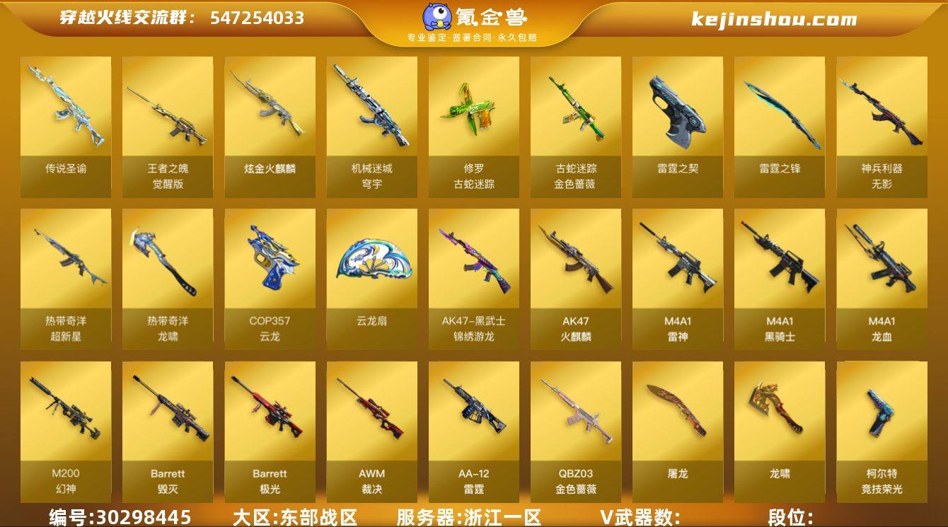 53V,1传说,2王者,1炫金,19CF点,游戏年龄8年;【传说武器1】:传说圣谕;【稀有套装1】:云龙套装;【重要角色7】:炫/王者-樱-热浪之夏/奇洋探员/灵狐者-黄金海岸/蜀雪/空/蛇隐宗;【武器皮肤6】:M200-幻神-黄忠/毁灭-墨兰/金色蔷薇-破浪逐光/雷神-R.LGD-CFPLS18冠军/火麒麟-CFSTAR/火麒麟-平天大圣;【英雄武器51】:M200-幻神/Barrett-极光/Barrett-毁灭*2/AWM-裁决/金色蔷薇-古蛇迷踪/QBZ03-金色蔷薇/QBZ03-云龙/M4A1-黑骑士/M4A1-雷神*2/M4A1-龙血/黑武士-锦绣游龙/无影-神兵利器/AK47-火麒麟/AA-12-雷霆/柯尔特-竞技荣光/COP357-云龙/COP357-雷霆/尼泊尔-雷霆/屠龙/龙啸-热带奇洋/龙啸/斩神刀-雷暴/唐刀-古蛇迷踪/云龙扇/高爆手雷-竞技荣光/高爆手雷-云龙/高爆手雷-雷霆*5/高爆手雷-古蛇迷踪/闪光弹-竞技荣光/闪光弹-雷霆*5/烟雾弹-竞技荣光/烟雾弹-云龙/烟雾弹-雷霆*6/烟雾弹-古蛇迷踪/机械迷城-穹宇/修罗-古蛇迷踪;【热门武器2】:1修罗/1黑骑士;【音效卡3】:AWM-裁决音效卡/M4A1-黑骑士音效卡/M200-幻神音效卡;【王者武器1】:王者之魄-觉醒版;【炫金武器1】:炫金火麒麟;【小人枪3】:HK417-朱雀-蛇隐宗/魔能飞环-曼陀罗/AWM-灵狐-15周年嘉年华;【挑战大师5】:末日裁决者/神罚/激光毁灭者III/唐刀-戎马一生/巡航者