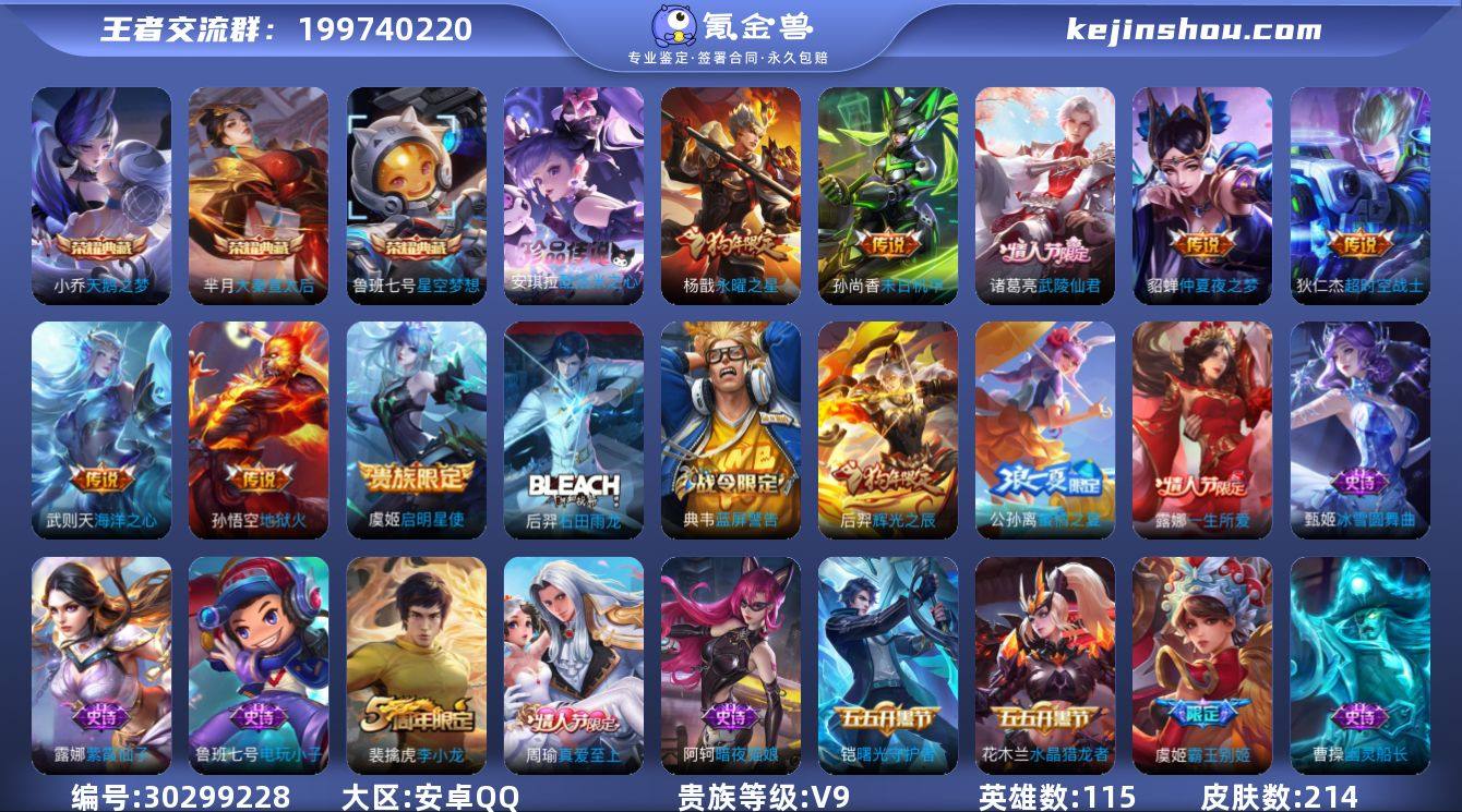 贵族等级:V9 典藏皮肤数:3 珍品无双皮肤数:0 无双皮肤数:0 珍品传说皮肤数:1 传说皮肤数:8 史诗皮肤数:48 皮肤数:214 英雄数:115 段位:铂金