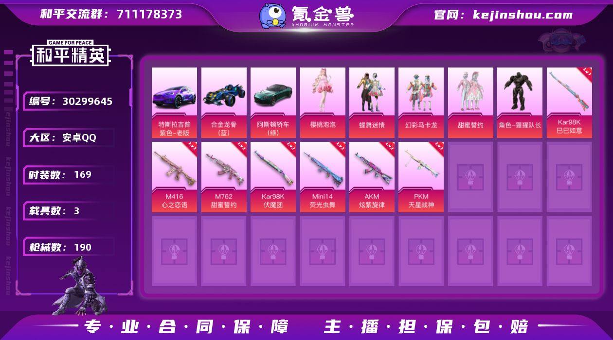 5粉装 7粉枪 3载具 169套装 190枪皮 45热门 特斯拉X紫色 阿斯顿马丁S绿色 合金龙骨蓝色 甜蜜誓约 幻彩马卡龙 蝶舞迷情 猩猩队长 角色-樱桃泡泡 M416-心之恋语(5级) AKM-炫紫旋律(4级) Kar98K-伏魔团(4级) M762-甜蜜誓约(5级) PKM-天星战神(5级) Mini14-荧光虫舞(3级) Kar98K-巳巳如意(2级) 雪山精英(老6服) 奇迹天团 机械英豪 破蛋小黄鸡 小丑鱼 浪漫波比 裁决冥王 暗夜契约 极速红龙 纯白誓言 M416-仓鼠灰灰 白色伏地魔 SS9特训 SS8特训 SS6特训 SS3特训 SS25特训 SS24特训 SS23特训 SS22特训 SS10特训 AWM-不夜海上花 AWM-飒粉甜心 GROZA-乌木金纹 GROZA-田园牧歌 AUG-幻影战神 M762-天降萌叽 Mk47-乌木金纹 MG3-幻世战舞者 AKM-春暖花开 M416-蓝色火焰 GROZA-春暖花开 M762-暗夜鎏金 长空猛禽 甜蜜熊情侣 沙漠雄狮 牛气冲天 霓虹街区 妙红点点 懵萌河马 风暴特警 黑色刀锋 神秘黑猫 白虎圣者 薄荷蓝莓 紫色滑翔尾迹 炫紫旋律飞行器 黄色滑翔尾迹 霓虹街区飞行器