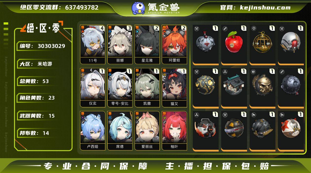 冒险等级:60 总黄数:53 菲林底片数量:300 菲林数量:888 加密母带数量:48 五星角色数:23 4命「11号」,3命丽娜,2命星见雅,2命珂蕾妲,1命仪玄,1命零号·安比,1命凯撒,1命猫又,0命卢西娅,0命席德,0命爱丽丝,0命柚叶,0命薇薇安,0命扳机,0命耀嘉音,0命浅羽悠真,0命月城柳,0命简,0命青衣,0命朱鸢,0命艾莲,0命莱卡恩,0命格莉丝 五星武器数:15 1精机巧心种,1精狸法七变化,1精青溟笼舍,1精牺牲洁纯,1精心弦夜响,1精霰落星殿,1精奔袭獠牙,1精啜泣摇篮,1精嵌合编译器,1精硫磺石,1精拘缚者,1精燃狱齿轮,1精钢铁肉垫,1精深海访客 邦布数量:14 5精艾丝弥小姐,5精咔嚓仔,5精巴特勒,3精罗宾,1精墨丘利,1精狮耶,1精格列佛探员,1精赤红莫库斯,1精阿崔巡查,1精鲨牙布,1精飚速布,1精插头布,1精左轮布,1精共鸣布 卖家说:购买这个账号赠送小鸡x5游戏手柄一个,不赠送可记作账号有问题申请售后 此号带原神,崩铁配队成型,崩铁角色练度都不错,可以直接上手,并且攒有四十抽可以备战4.0,绝区零角色练度都很好练度都有,并且号上还攒有30抽,原神也有但是不怎么玩了,买到就是赚到