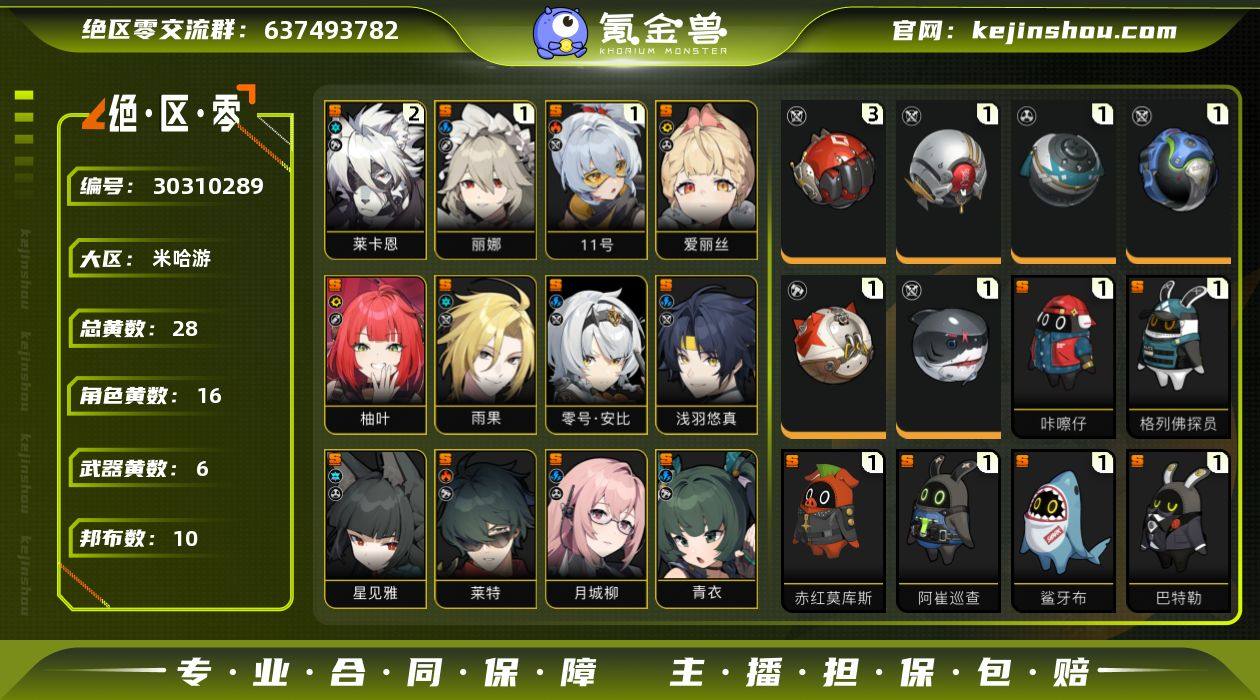 冒险等级:60 总黄数:28 菲林底片数量:0 菲林数量:135 加密母带数量:223 五星角色数:16 2命莱卡恩,1命丽娜,1命「11号」,0命爱丽丝,0命柚叶,0命雨果,0命零号·安比,0命浅羽悠真,0命星见雅,0命莱特,0命月城柳,0命青衣,0命朱鸢,0命艾莲,0命格莉丝,0命珂蕾妲 五星武器数:6 3精钢铁肉垫,1精牺牲洁纯,1精时流贤者,1精防暴者VI型,1精燃狱齿轮,1精深海访客 邦布数量:10 1精咔嚓仔,1精格列佛探员,1精赤红莫库斯,1精阿崔巡查,1精鲨牙布,1精巴特勒,1精飚速布,1精插头布,1精左轮布,1精共鸣布 卖家说:内置225up抽数95普通抽数24金