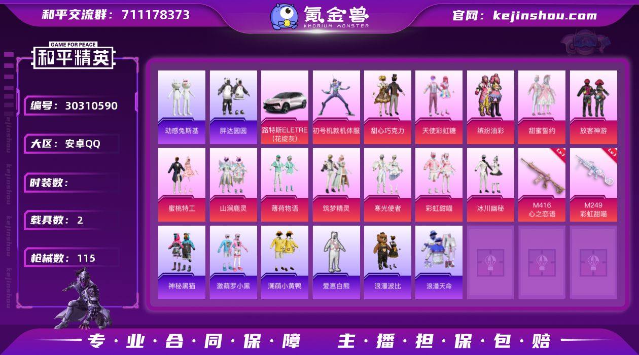 (可二次实名) 【公主素材号】螳螂-浪漫天命-满级M249-彩虹甜喵-发光眼镜-4淘汰盒子-粉熊背包-安卓Q-超级王牌1星-46111热力值 7王牌印记 140套装 115枪皮 【2载具】 路特斯EL灰色 萌兔起飞僚机 【1稀有】 SCAR-L-粉色回忆 【14粉装】 紫螳螂 梦幻火箭 天使彩虹糖 甜心巧克力 缤纷油彩 放客神游 筑梦精灵 甜蜜誓约 冰川幽秘 彩虹甜喵 蜜桃特工 薄荷物语 山涧鹿灵 寒光使者 【2特效枪】 M416-心之恋语 (2级) M249-彩虹甜喵 (7级) 【1飞行器】 童趣迷兔飞行器 【13热门】 雪山精英(老6服) 动感兔斯基 潮萌小黄鸭 浪漫天命 爱崽白熊 激萌罗小黑 浪漫波比 胖达圆圆 神秘黑猫 暗夜契约 纯白誓言 Mini14-林间仙鹿 GROZA-林间仙鹿 【3头盔】 梦幻火箭头盔 甜心宝贝头盔 甜蜜誓约头盔 【6背包】 精灵迷巫背包 梦幻火箭背包 甜心宝贝背包 萌熊伴侣背包 神秘黑猫背包 甜蜜誓约背包 营地ID:744576902 PX_979624