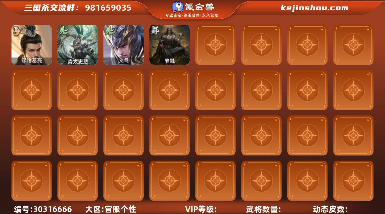 官阶:大将军;VIP等级:VIP8;史诗武将数量:36;动态皮肤数量:29;武将总数:365;史诗宝珠数量:5;将魂数量:4737;神将:3;魏国史诗武将:16;蜀国史诗武将:6;吴国史诗武将:8;群史诗武将:12 神吕布,神赵云,神诸葛亮,SP司马昭,曹髦,星周不疑,界钟会,嵇康,曹纯,戏志才,清河公主,程昱,关索,谋赵云,谋马超,赵襄,沙摩柯,花鬘,周处,吴景,骆统,界朱然,界徐盛,势陆郁生,文鸯,左慈,张让,审配,麹义,沮授,界李儒,公孙康,卑弥呼,谋张角,许攸,星董卓,兀突骨,神吕蒙,神周瑜,神关羽,势夏侯尚,SP关羽,SP蔡文姬,乐进,曹昂,诸葛诞,朱灵,文聘,SP姜维,张春华,钟会,曹冲,郭淮,满宠,界王异,界曹操,界司马懿,界夏侯惇,界张辽,界许褚,界郭嘉,李典,曹真,韩浩史涣,陈群,曹叡,曹休,钟繇,司马朗,王基,李通,郭皇后,孙资刘放,辛宪英,界甄姬,吕虔,鲁芝,界典韦,界荀彧,杜畿,界曹丕,界邓艾,张恭,贾逵,界曹植,界曹彰,卞夫人,界陈群,华歆,蔡贞姬,袁涣,崔琰,毛玠,谋徐晃,谋于禁,谋荀彧,界曹休,牵招,胡班,谋夏侯渊,牛金,界夏侯渊,界曹仁,臧霸,董昭,势陈到,SP孙尚香,关银屏,夏侯霸,马良,关兴张苞,廖化,界马岱,关平,简雍,刘封,界法正,界关兴张苞,界刘备,界关羽,界张飞,界赵云,界马超,SP徐庶,吴懿,周仓,张松,刘谌,夏侯氏,糜竺,马忠,李严,黄皓,吴苋,秦宓,界黄月英,界诸葛亮,赵统赵广,界庞统,界孟获,界祝融,界姜维,张翼,杨仪,邓芝,傅肜,界简雍,费祎,糜夫人,王甫赵累,界周仓,向宠,刘巴,界吴懿,彭羕,谋庞统,谋张飞,吴班,霍峻,诸葛果,界魏延,蒋琬费祎,糜芳傅士仁,甘夫人,鲁肃,孙茹,凌操,大乔小乔,诸葛恪,诸葛瑾,孙鲁育,程普,韩当,潘璋马忠,虞翻,朱然,界周泰,界甘宁,界吕蒙,界黄盖,界周瑜,界大乔,界陆逊,孙鲁班,朱桓,顾雍,孙休,朱治,全琮,孙登,岑昏,徐氏,薛综,界孙权,界孙尚香,SP庞统,严畯,吕岱,周妃,卫温诸葛直,界凌统,界韩当,界虞翻,界潘璋马忠,孙邵,桥公,张温,...
