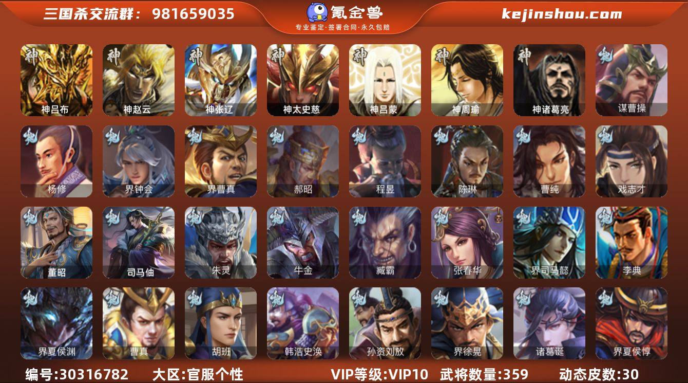 VIP等级: VIP10 官阶: 大将军 武将数量: 359 动态皮肤数量: 30 神将: 神吕布,神太史慈,神张辽,神赵云,神吕蒙,神周瑜,神诸葛亮 魏国武将: 戏志才,曹纯,陈琳,程昱,郝昭,界曹真,界钟会,杨修,谋曹操,唐咨-魏,张辽,SP蔡文姬,SP曹仁,SP关羽,SP贾诩,SP姜维,SP庞德,卞夫人,蔡贞姬,曹昂,曹操,曹冲,曹洪,曹丕,曹仁,曹叡,王异,张恭,鲁芝,界满宠,曹休,界曹植,满宠,荀攸,王基,钟繇,蒯越蒯良,郭嘉,荀彧,杜畿,界郭嘉,崔琰,界荀彧,朱灵,界甄姬,吕虔,界陈群,界王异,界许褚,界郭淮,华歆,陈群,界邓艾,界典韦,界曹休,袁涣,乐进,辛宪英,郭淮,界曹彰,郭皇后,毌丘俭,夏侯惇,曹植,司马朗,谋于禁,界曹操,许褚,界张辽,谋徐晃,张郃,钟会,文聘,曹彰,界夏侯惇,诸葛诞,司马懿,甄姬,界徐晃,徐晃,孙资刘放,韩浩史涣,胡班,曹真,典韦,界夏侯渊,夏侯渊,李典,于禁,邓艾,界司马懿,张春华,臧霸,牛金,朱灵(国战),司马伷,董昭 蜀国武将: 关索,花鬘,界黄忠,谯周,沙摩柯,张星彩,赵襄,谋马超,谋赵云,谋夏侯氏,谋黄忠,马云騄,徐庶,界魏延,吕凯,界关羽,界诸葛亮,界伊籍,费祎,严颜,界黄月英,赵云,张松,李丰,界刘备,谋姜维,刘封,糜竺,蒋琬,谋庞统,黄月英,刘巴,关羽,吴懿,吴班,向宠,祝融,张飞,黄皓,陈震,魏延,界周仓,马忠,界法...