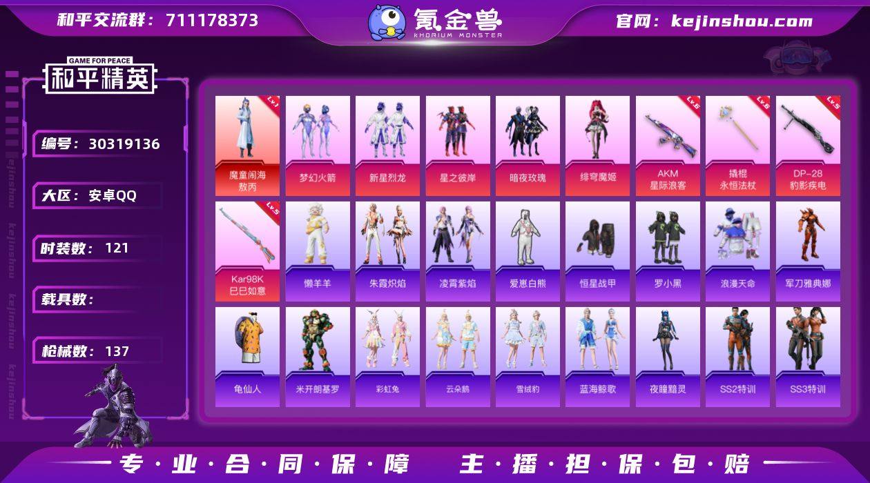 安卓 手Q-1神装-5粉装-4特效枪-0载具-0粉色飞行器-45481热力值-8王牌印记-121套装-137枪皮 【红色神装等级】:魔童闹海-敖丙(一级) 【红色角色神装】:魔童闹海-敖丙 【热门品类】:粉装-梦幻火箭,套装-浪漫天命,角色-军刀雅典娜,套装-龟仙人 【粉色套装】:粉装-梦幻火箭,粉装-新星烈龙,粉装-星之彼岸,粉装-暗夜玫瑰,角色-绯穹魔姬 【粉色枪皮等级】:AKM-星际浪客(六级),Kar98K-巳巳如意(五级),DP-28-豹影疾电(五级),撬棍-永恒法杖(六级) 【粉色枪皮】:AKM-星际浪客,Kar98K-巳巳如意,DP-28-豹影疾电,撬棍-永恒法杖 【粉色降落伞】:梦幻火箭降落伞,星之彼岸降落伞,环太平洋降落伞,彩虹甜喵降落伞,未来歌姬降落伞,星穹咏叹调降落伞,冷漠罗丽降落伞,绯穹魔姬降落伞,魔童闹海 敖丙降落伞 【稀有套装】:套装-龟仙人,套装-雪国风尚,角色-米开朗基罗,套装-彩虹兔,套装-云朵鹅,套装-雪绒豹,套装-蓝海鲸歌,角色-夜瞳黯灵,套装-朱霞炽焰,套装-凌霄紫焰,玩偶服-懒羊羊 【稀有枪皮】:AKM-四圣焕新,AKM-彩虹符号,AKM-星之彼岸,AKM-环太平洋,AKM-生命誓言,AKM-百万伏特,AKM-霓虹街区,M16A4-幻世战舞者,M16A4-红色方程式,M16A4-蓝色火焰,SCAR-L-幽秘魅影,SCAR-L-炫彩节奏,SCAR-L-红色方程式,M416-红色方程式,M416-蓝色火焰,M416-魔法学院,GROZA-懵萌河马,AUG-耀粉歌者,AUG-黑白懵懵牛,QBZ-彩虹符号,M762-天降萌叽,M762-彩虹符号,M762-牛气冲天,M762-绯红前夜,M762-云朵鹅,G36C-懵萌河马,AC-VAL-天降萌叽,蜜獾-天降萌叽,蜜獾-绯穹魔姬,ARX-凌霄紫焰,UZI-幽秘魅影,UZI-影袭,UMP45-夜灯,UMP45-涂山之恋,UMP45-生命誓言,UMP45-蓝色火焰,Vector-彩虹符号,Vector-生命誓言,JS9-凌霄紫焰,P90-巳巳如意,Kar98K-彩虹符号,Kar98K-梦幻火箭,Kar98K-王子的夏...