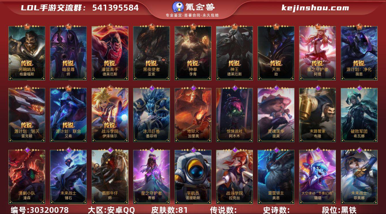 94英雄-81皮肤 LK2512284 【神话皮肤】:夜星流火 金克丝 【传说皮肤】:源计划:净化 薇恩,暗星尊 烬,黑夜使者 亚索,星之守护者 阿狸,天煞 劫,神拳 李青,灌篮高手 德莱厄斯,神王 德莱厄斯,光明哨兵 格雷福斯,源计划:联合 艾希,战斗学院 伊泽瑞尔,双城之战:殊途 杰斯,源计划:泯灭 雷克顿 【史诗皮肤】:霸天剑魔 亚托克斯,战斗学院 拉克丝,惊悚派对 阿木木,清剿小队 金克丝,双城之战:天资 金克丝,末路管家 布隆,礼物选好了吗? 布隆,西部牛仔 烬,清剿小队 潘森,未来战士 菲奥娜,我,羽饰骑士 崔丝塔娜,灵魂莲华 提莫,太空律动 “节奏幻师” 璐璐,破败军团 希瓦娜,魔女 婕拉,冰川巨兽 墨菲特,暗星 墨菲特,地狱火 加里奥,腥红之月 希维尔,欧米伽小队 天雷爆破手 维迦,星之守护者 赛娜,未来战士 锤石,宇航员 诺提勒斯,雷霆领主 奥恩 【赛季皮肤】:s5绯金魅影,s6绯金丽刃,s7绯金战斧,s8绯金鮫灵,s9王牌舰长,s13龙冕御盾,s14龙冕神策,s15龙冕异士,s16冠翎飞行员,s17冠翎御风使,S18冠翎巨神像,S19冠翎征服者 【其他皮肤】:海上霸主 盖伦,暗黑武士 雷恩加尔,秘密特工 赵信,死亡绽放 卡兹克,末路狂花 金克丝,双城之战 金克丝,龙冕御盾 布隆,龙冕异士 烬,王牌舰长 崔斯特,冠翎征服者 尼菈,绯金魅影 伊芙琳,银色之牙 阿卡丽,绯金丽刃 菲奥娜,小红帽 安妮,冲击之刃 劫,末世天使 凯尔,游击队员 崔丝塔娜,兔宝宝 提莫,熊猫 提莫,女警官 蔚,双城之战 蔚,双城之战:破枷 蔚,孤胆英豪 嘉文四世,至高之拳 李青,冠翎飞行员 库奇,女帝 厄运小姐,黑暗骑士 格雷福斯,冠翎御风使 迦娜,德莱德莱 德莱文,绯金战斧 德莱文,龙冕神策 吉格斯,飞车暴走族 古拉加斯,碎桶者 古拉加斯,绯金鲛灵 娜美,迅箭 韦鲁斯,莲花之令 艾瑞莉娅,蕉泥座人 索拉卡,光...