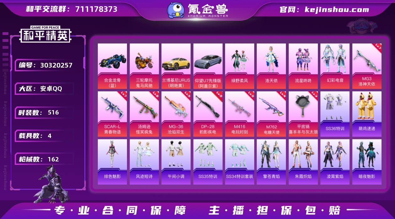 苹果 手Q-4粉装-12特效枪-2载具-2粉色飞行器-90156热力值-17王牌印记-208套装-285枪皮 【热门品类】:套装-派对舞王,套装-奇异狩猎者,套装-龟仙人,套装-暗影哥特,角色-Mark.06 【粉色套装】:粉装-智能音符,粉装-王牌四分卫,角色-呆萌星弥,角色-烟云彩露 【粉色枪皮等级】:AKM-绿萝繁花(五级),SCAR-L-锦绣绵绵(五级),M416-心之恋语(七级),M416-暖熊萌萌(五级),M416-电玩时刻(五级),GROZA-镜光银凌(五级),AUG-暖羊咩咩(五级),蜜獾-异瞳寒姬(四级),UMP45-量子极限(五级),Kar98K-巳巳如意(五级),DP-28-豹影疾电(三级),破片手榴弹-热量炸弹(七级) 【粉色载具】:特斯拉Roadster(水滴蓝),萌喵橘座 【粉色枪皮】:AKM-绿萝繁花,SCAR-L-锦绣绵绵,M416-心之恋语,M416-暖熊萌萌,M416-电玩时刻,GROZA-镜光银凌,AUG-暖羊咩咩,蜜獾-异瞳寒姬,UMP45-量子极限,Kar98K-巳巳如意,DP-28-豹影疾电,破片手榴弹-热量炸弹 【粉色飞行器】:龙翔九天飞行器 【粉色降落伞】:潮汐统领降落伞,齐天大圣降落伞,洛神天依降落伞,暖熊萌萌降落伞,闲梦青缨降落伞,圣堂之誓降落伞,沙丘之主降落伞,创世·救赎降落伞,临安公主降落伞,异瞳寒姬降落伞 【稀有套装】:套装-龟仙人,套装-巳巳如意,套装-糖糖葫芦,套装-青团波波,角色-临安公主,套装-燕燕于飞,套装-鱼渊荷华,套装-晶辉守护,套装-闪电轻猫,套装-朱霞炽焰,套装-凌霄紫焰,角色-申公豹 【稀有枪皮】:AKM-四圣焕新,AKM-夜灯,AKM-灼热熔岩,AKM-玉龙,AKM-生命誓言,AKM-筑梦精灵,AKM-萌趣颜团子,AKM-虎虎生威,AKM-霓虹街区,AKM-龙的传人,M16A4-夜灯,M16A4-幻世战舞者,M16A4-甜心亚梦,M16A4-生命誓言,M16A4-红色方程式,SCAR-L-夜灯,SCAR-L-炫彩节奏,SCAR-L-玉兔迎春,SCAR-L-红色方程式,SCAR-L-小狗蛇点点,SCAR-L-净心行者...
