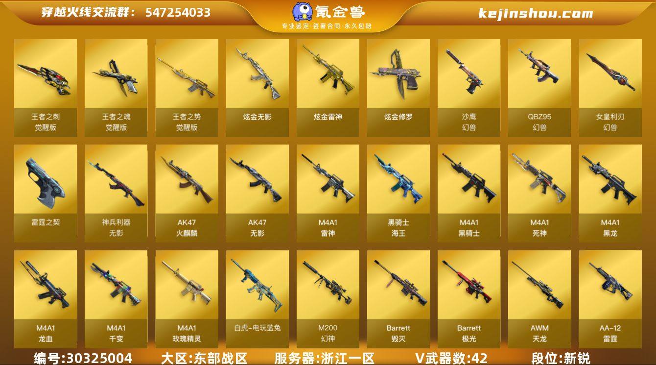 段位:新锐 V武器数:42 王者武器数:3 炫金武器数:3 王者之刺-觉醒版,王者之魂-觉醒版,王者之势-觉醒版 炫金无影,炫金雷神,炫金修罗 沙鹰-幻兽,QBZ95-幻兽,女皇利刃-幻兽,雷霆之契,无影-神兵利器,AK47-火麒麟,AK47-无影,M4A1-雷神,黑骑士-海王,M4A1-黑骑士,M4A1-死神,M4A1-黑龙,M4A1-龙血,M4A1-千变,M4A1-玫瑰精灵,白虎-电玩蓝兔,M200-幻神,Barrett-毁灭,Barrett-极光,AWM-天龙,AA-12-雷霆,AK12-天启,AN94-超新星,9A91-烈火,屠龙,龙啸,麒麟刺,擎天,M200-竞技荣光,柯尔特-竞技荣光,擎天-竞技荣光,幻灵之锋,裁决,M4A1神工天巧,USP神工天巧,唐刀神工天巧 王者-零,王者之瞳 炽天使,电竞教官-云悠悠,樱,樱-青春偶像 M4A1-黑骑士音效卡