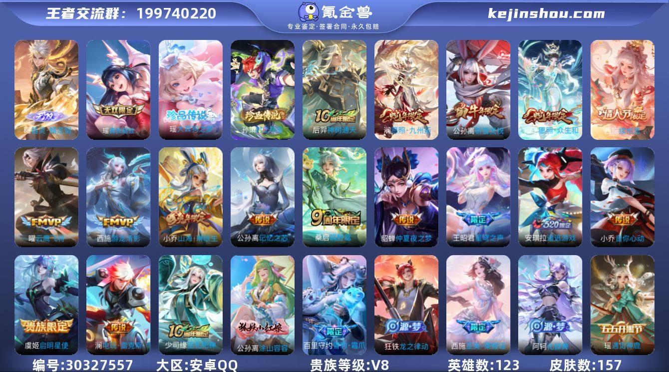 贵族等级:V8 典藏皮肤数:0 珍品无双皮肤数:0 无双皮肤数:2 珍品传说皮肤数:2 传说皮肤数:16 史诗皮肤数:49 皮肤数:157 英雄数:123 段位:星耀