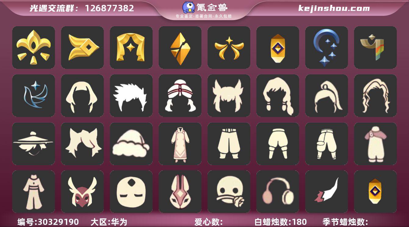 账号类型: 邮箱账号 季节已毕业: 梦想季,小王子季,风行季,潜海季,表演季,破晓季,欧若拉季,夜行季,追忆季,拾光季,归巢季,九色鹿季,筑巢季,二重奏季,姆明季,彩染季,青鸟季,双星季,迁徙季 完成地图: 晨岛,云野,雨林,霞谷,暮土,禁阁 珍稀物品: 白枭,透明蝶翼斗,玫瑰花,彩虹围巾 礼包: 蝙蝠套,巫师,莲花斗,绊爱,鹿角,秋千,茶桌,茶壶,白绒金,吉他,橘子,红伞,兔子,枯角,雪花,星月头饰 裤子: 武士裤,背带裤,搓澡巾,妮妮裙子,王子服,蓝绿裤,飞天裤,筑巢季·裤子,青鸟尊贵蓬头裤子 面具: 凤凰面具,贴花面具,呼吸面具,夜行毕业面具,黄眉企鹅面具,辉光羚羊面具 面饰: 红耳机,黑框眼镜,青鸟毕业面饰 项链: 围巾 发型: 归巢毕业发型,若笠,虚荣,单侧绑发,小王子发型,留辫蘑菇头,飞天盘发 头饰: 行军锅头盔,羽毛发饰,牛仔帽,蓝色音乐会,平顶帽 斗篷: 海洋斗,蟑螂斗,绿芽,粉红绒毛斗篷,遥鲲斗篷,燕尾斗篷,冥龙斗篷,彩染围巾斗篷,青鸟毕业斗篷 配饰: 雨伞,筑巢季·小手办,高音钢琴,姆明抱枕,小红伞,相机,玫瑰花,二重奏挂画,鲲灯 亮点: 【优质装备】:表演季,白枭(帝企鹅发),武士裤,梦想季,小王子季(王子季),风行季,潜海季,破晓季,透明蝶翼斗,欧若拉季(欧若拉),归巢毕业发型(五塑彩羽发),行军锅头盔(六边锅帽子)(双耳锅帽子),羽毛发饰(多羽发饰),筑巢季·小手办(光之子试衣),高音钢琴(白色高脚钢琴),玫瑰花,夜行季,追忆季,妮妮裙子(妮妮长裙),牛仔帽(西部帽),姆明抱枕,小红伞(姆明红伞)(姆明大伞),相机(季卡相机),拾光季,彩虹围巾(五塑彩带斗),归巢季,九色鹿(九色鹿季),王子服(小王子套装),蓝绿裤(高领舞服),飞天裤(柔缎花边连)(九色鹿丝带裤),蟑螂斗(凤凰斗篷),围巾(肩带),筑巢季,蝙蝠套(蝙蝠斗篷)(南瓜头),红耳机,晨岛,云野,雨林,霞谷,墓土(暮土),禁阁,若笠(箬笠),青鸟尊贵蓬头裤子(蓝色燕尾服),二重奏季,二重奏挂画(合奏挂画),姆明季,...