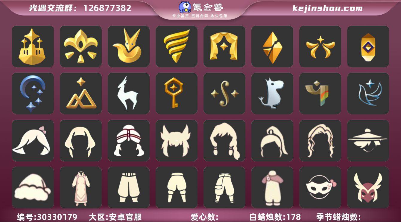 姆明饰品套装,奔离远行发型,鲤鱼龙门,多彩绒绒帽,蛛网朋克,巫师帽 区服:安卓官服邮箱'登入方式:邮箱'蜡烛数量:1298爱心:139当前身高5.100最高身高1.565最矮身高13.565'已经毕业地图:晨岛,云野,雨林,霞谷,暮土,禁阁'已经毕业季节:彩染季,姆明季,九色鹿季,归巢季,拾光季,夜行季,追忆季,欧若拉季,破晓季,表演季,潜海季,风行季,王子季,集结季,梦想季'有预言季卡'稀有礼包:疯女巫长裙,奔离远行服饰,献给爱的裙装,祥云瑞气服饰,园丁装扮,彩虹武士裤,跃动跑鞋,星月头冠,彩虹耳饰,彩虹耳机,金鳞耳坠,巫术犄角,圣诞鹿角,优雅领结,姆明饰品套装,奔离远行发型,鲤鱼龙门,多彩绒绒帽,蛛网朋克,巫师帽,南瓜头,绊爱套装,渐变双马尾发型,贝壳,雪花发卡,玉兔,大桔大利,四叶草头饰,夏日有友,心心相印发饰,tgc,创始人礼包,小王子围巾,星球夹克,AURORA 之翼,臣服斗篷,新春福娃,海龟斗篷,皮皮猫装扮,蜘蛛斗篷,蝙蝠斗篷,白雪斗篷,暖冬瑞雪,粽子,雏鸟之琴,音韵吉他,凯旋手碟,欧若拉之声,惊喜手杖,灯笼,阳伞,祥云瑞气纸伞,献瑞折扇礼包,狐狸背包,情人秋千,情人跷跷板,情人小船,花憩茶几,茶桌,野餐礼包,皮皮猫,冥龙南瓜,冰雪水晶球,篝火点心,球赛礼包,自然之声,中国绊爱大铁头,古典音乐桌椅'热门物品:蝴蝶结,公主头,正太头,樱花头,猫猫头,搓澡巾,武士裤,白棉裤,背带裤,花环头饰,宴会围巾,虚荣发型,红耳机,黄鼠狼面具,红狐狸面具,花瓣斗篷,灯泡斗篷,红金斗篷,白金斗篷,白鸟斗篷,吉他,尤克里里,高音钢琴,笛子,排箫,铃铛,雨伞