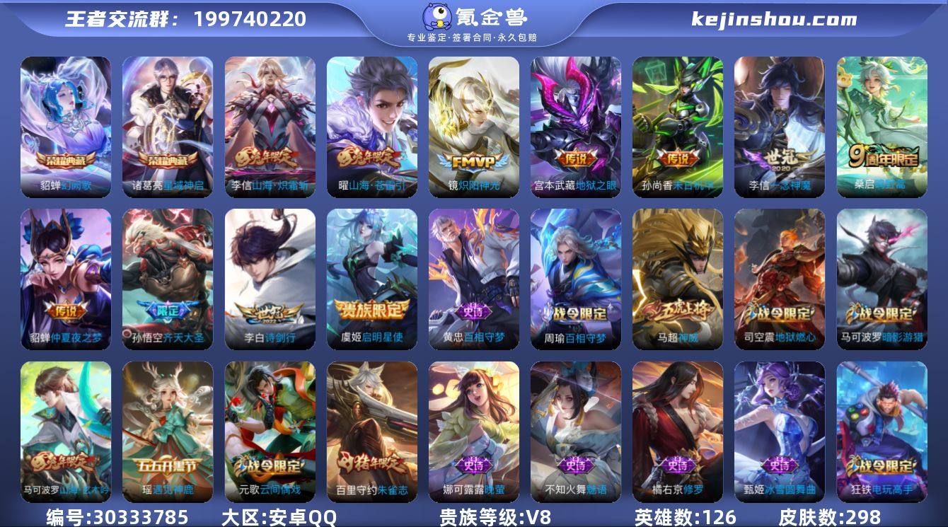 贵族等级:V8 典藏皮肤数:2 珍品无双皮肤数:0 无双皮肤数:0 珍品传说皮肤数:0 传说皮肤数:11 史诗皮肤数:92 皮肤数:298 英雄数:126 段位:绝世王者