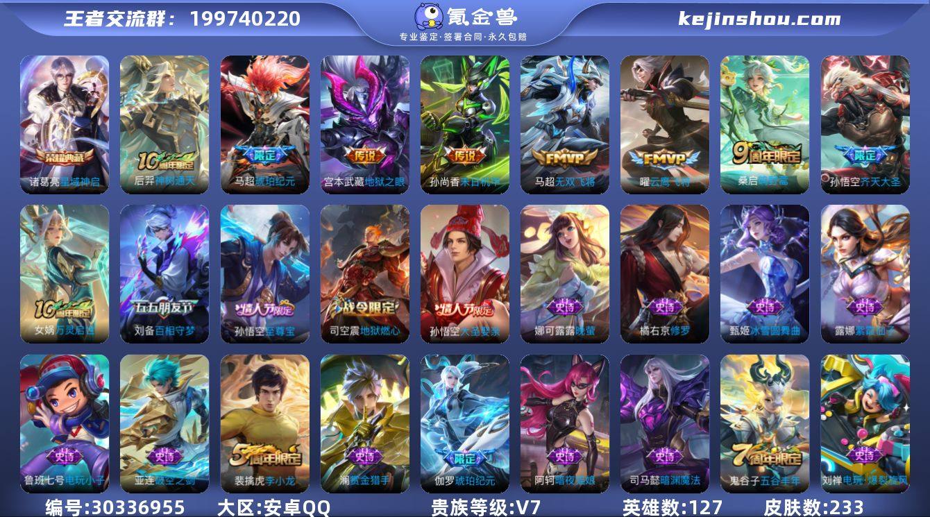 贵族等级:V7 典藏皮肤数:1 珍品无双皮肤数:0 无双皮肤数:0 珍品传说皮肤数:0 传说皮肤数:8 史诗皮肤数:65 皮肤数:233 英雄数:127 段位:绝世王者