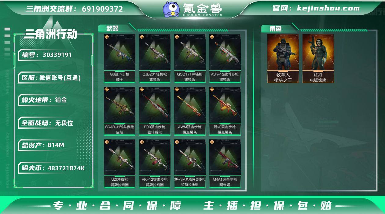 总资产:814M 哈夫币:483721874K 烽火地带等级:60 烽火地带段位:铂金 全面战场等级:0 全面战场段位:无段位 牧羊人-街头之王,红狼-电锯惊魂 卖家说:纯绿自玩号,玩了一年多属于鼠鼠玩家,做了五个赛季九格安全箱,强度不高对战爽,币子也足够玩