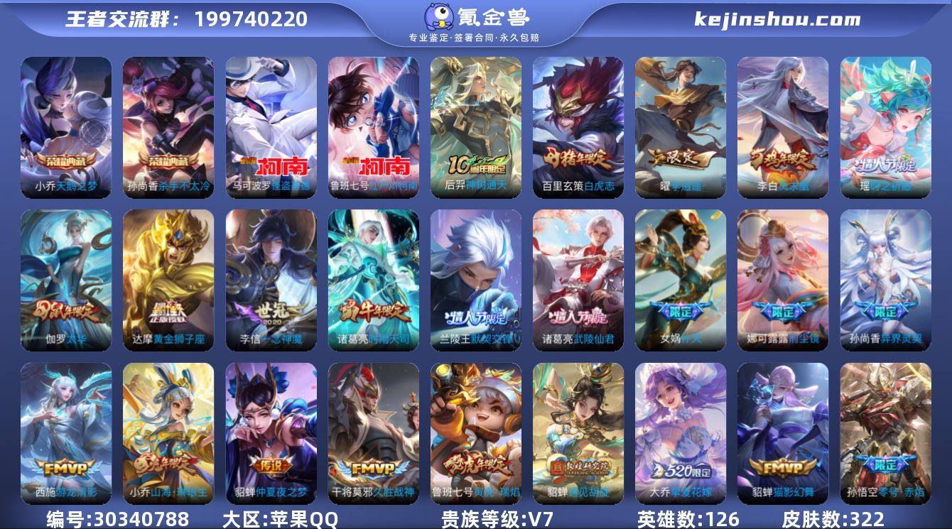 贵族等级:V7 典藏皮肤数:2 珍品无双皮肤数:0 无双皮肤数:0 珍品传说皮肤数:2 传说皮肤数:32 史诗皮肤数:104 皮肤数:322 英雄数:126 段位:传奇王者 卖家说:好