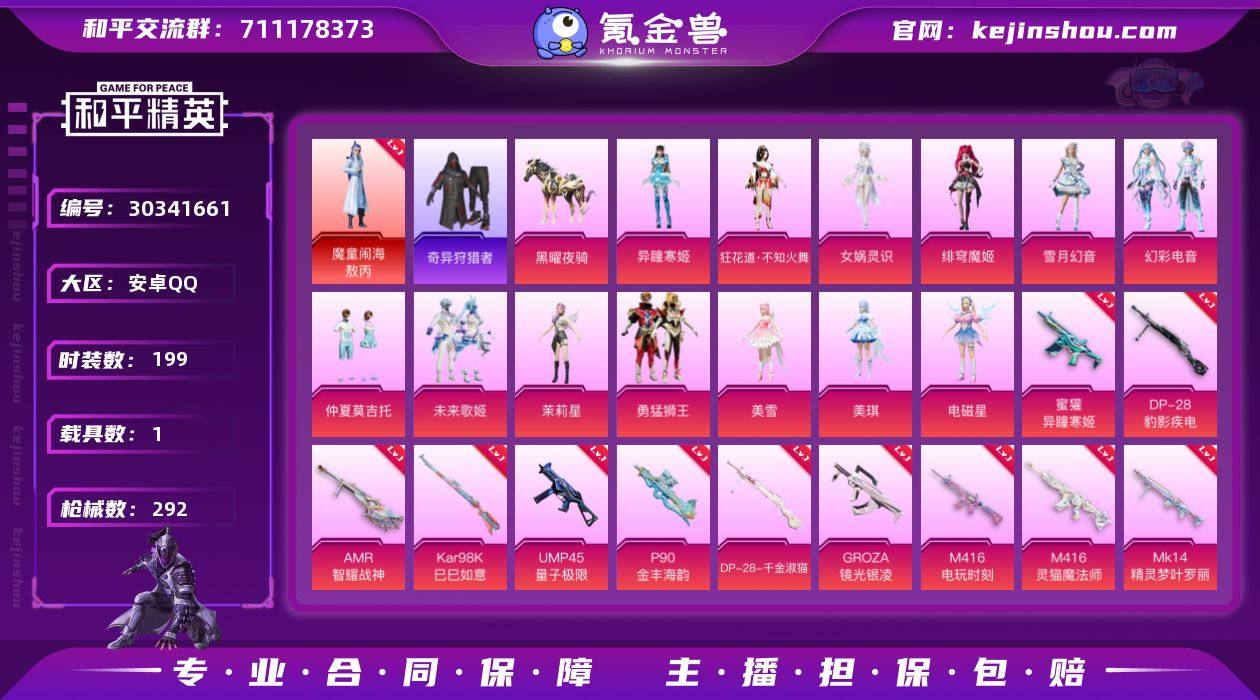 可二次【1红装3级敖丙 13粉装16特效枪1载具可秒换绑】 安卓Q区-99556热力值-17印记-199套装-292枪皮 【1红装】 魔童闹海-敖丙(3级)【1载具】 黑曜夜骑【3稀有】 Mark.06 奇异狩猎者 派对舞王【13粉装】 角色-美雪 角色-美琪 勇猛狮王 茉莉星 仲夏莫吉托 未来歌姬 雪月幻音 角色-电磁星 幻彩电音 角色-狂花道·不知火舞 角色-绯穹魔姬 角色-女娲灵识 角色-异瞳寒姬【16特效枪】 SCAR-L-青春物语(6级) AUG-超新星(7级) M416-风花雪月(4级) AKM-绿萝繁花(5级) M416-电玩时刻(5级) UMP45-量子极限(5级) Mk14-精灵梦叶罗丽(4级) PKM-江南烟雨(5级) AMR-智耀战神(5级) P90-金丰海韵(5级) M416-灵猫魔法师(3级) GROZA-镜光银凌(5级) DP-28-千金淑猫(2级) Kar98K-巳巳如意(5级) DP-28-豹影疾电(5级) 蜜獾-异瞳寒姬(2级)【40热门】 M416-蓝色火焰 GROZA-彩虹符号 长空猛禽 虚音幻奏 甜心亚梦 甜蜜熊情侣 牛气冲天 霓虹街区 妙红点点 懵萌河马 S686-奇异狩猎者 浪漫天命 激萌罗小黑 金羽特工 暗影哥特(红眼罩) 忍者信条 狂沙舞者 冰公主 SS27特训 SS26特训 SS25特训 SS24特训 SS23特训 SS22特训 Mark.06 SCAR-L-玉兔迎春 GROZA-田园牧歌 M762-天降萌叽 M762-彩虹符号 Mk47-乌木金纹 SKS-糯团青竹 Mini14-旋转彩虹 UZI-娇憨猪猪 UMP45-蓝色火焰 DBS-彩虹符号 M249-彩虹符号 MG3-幻世战舞者 AKM-星之彼岸【10飞行器】 光之冒险尾迹 超新星飞行器 粉色滑翔尾迹 空岛之星尾迹 鸿潮鸣舰飞行器 彩虹独角兽飞行器 炫彩糖果飞行器 灵猫魔法师飞行器 万象金身飞行器 灵珠游龙飞行器 营地ID:790058864