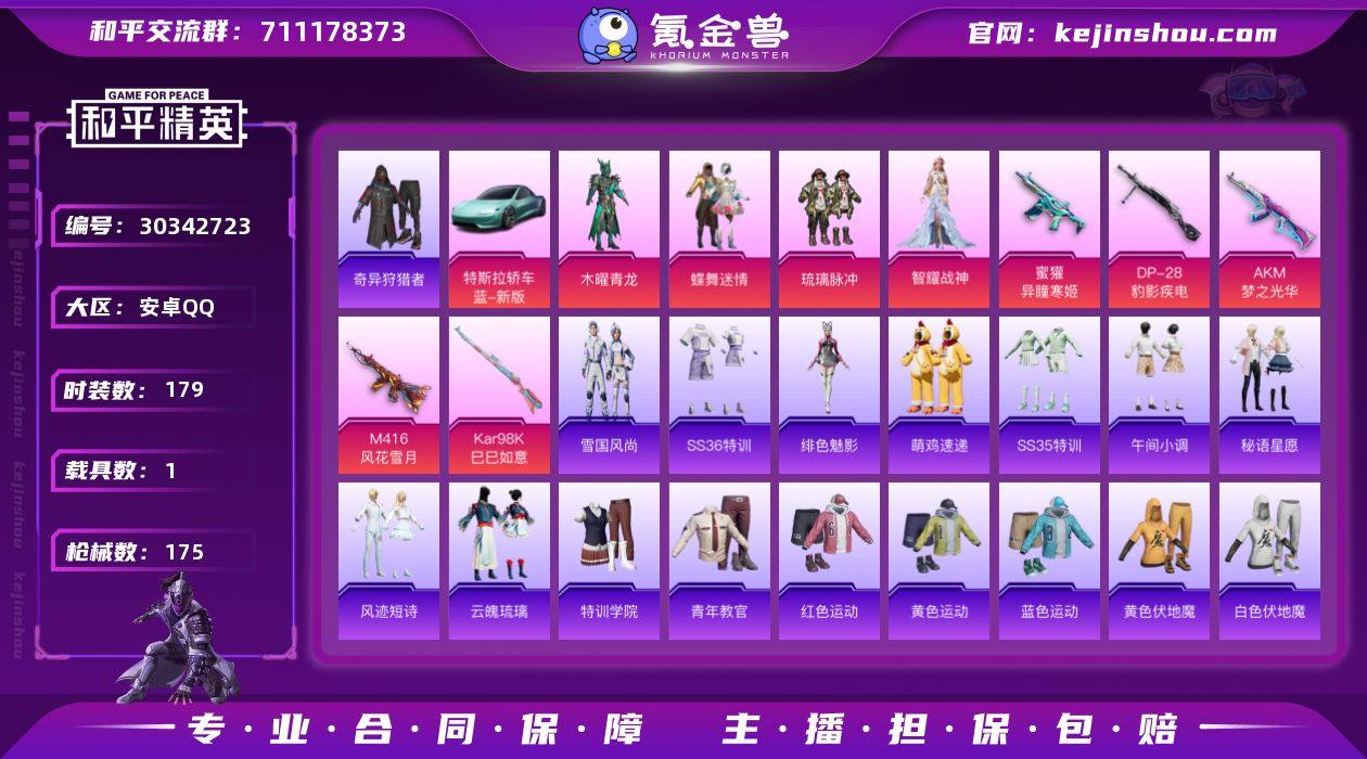 【1载具 5特效枪 4粉装 175枪皮 179套装】连体号王者v8,1典藏17传说61史诗/6印记/5.6万热力值/57级收藏家/有小恐龙,老六服/套装-沙漠毒蛇,套装-SS1特训,套装-雪山精英,套装-奇异狩猎者,套装-金耀舞者,套装-木曜青龙,套装-蝶舞迷情,套装-琉璃脉冲,角色-智耀战神/5升级枪:AKM-梦之光华,蜜獾-异瞳寒姬,M416-风花雪月,Kar98K-巳巳如意,DP-28-豹影疾电/1载具:特斯拉Roadster(水滴蓝)/2飞行器:炫彩糖果飞行器,纯梦嫁纱飞行翼/其他具体看截图189487798x,编号:LYQAK56