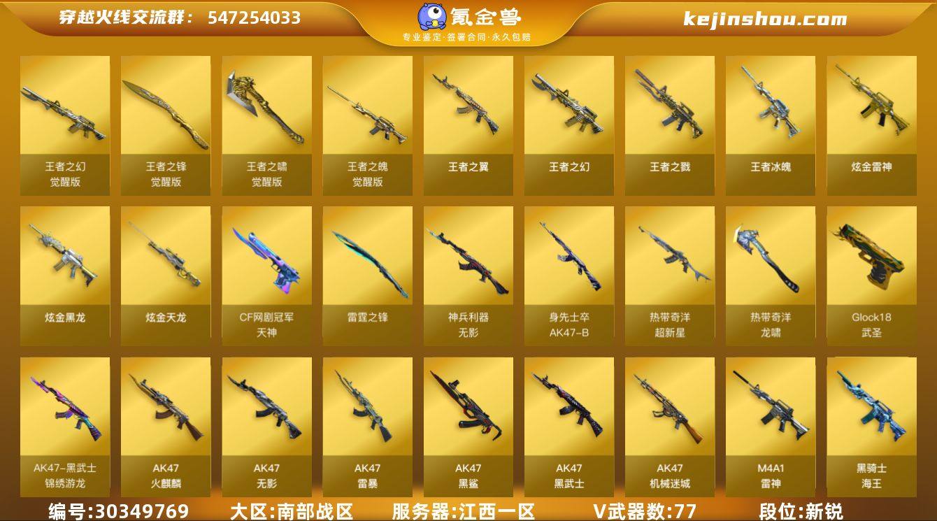 段位:新锐 VIP等级:VIP6 V武器数:77 王者武器数:13 炫金武器数:4 王者之幻-觉醒版,王者之锋-觉醒版,王者之啸-觉醒版,王者之魄-觉醒版,王者之翼,王者之幻,王者之戮,王者冰魄 炫金雷神,炫金黑龙,炫金天龙 天神-CF网剧冠军,雷霆之锋,无影-神兵利器,AK47-B-身先士卒,超新星-热带奇洋,龙啸-热带奇洋,Glock18-武圣,AK47-黑武士-锦绣游龙,AK47-火麒麟,AK47-无影,AK47-雷暴,AK47-黑鲨,AK47-黑武士,AK47-机械迷城,M4A1-雷神,黑骑士-海王,M4A1-黑骑士,M4A1-死神,M4A1-黑龙,M4A1-青龙,M4A1-龙血,M4A1-武圣,M4A1-千变,M4A1-猎神,白虎-电玩蓝兔,M200-幻神,Barrett-毁灭,Barrett-极光,Barrett-朱雀,AWM-天龙,AA-12-雷霆,AK12-天启,AN94-超新星,屠龙,龙啸,麒麟刺,擎天,柯尔特-竞技荣光,USP-雷暴,擎天-竞技荣光,AK47-B-常胜将军,Barrett-暗月传说,柯尔特-电竞装甲,斩神刀-雷暴,AK47-B-战士,AK47-B-战神,AK-47-猩红传说,裁决,天神,雷神-荣耀世冠,龙啸-烈火龙威,烈火-动感闪耀,天神-动感闪耀,屠龙-动感闪耀,擎天-云海游龙 王者-葵-貂蝉,王者-零-传说之路,王者-零-华冠丽服,王者涂鸦 葵,零,审判者,瞳,炫,鹰,职业选手 M4A1-黑骑士音效卡,Barrett-极光音效卡,Barrett-毁灭音效卡,M4A1-雷神音效卡