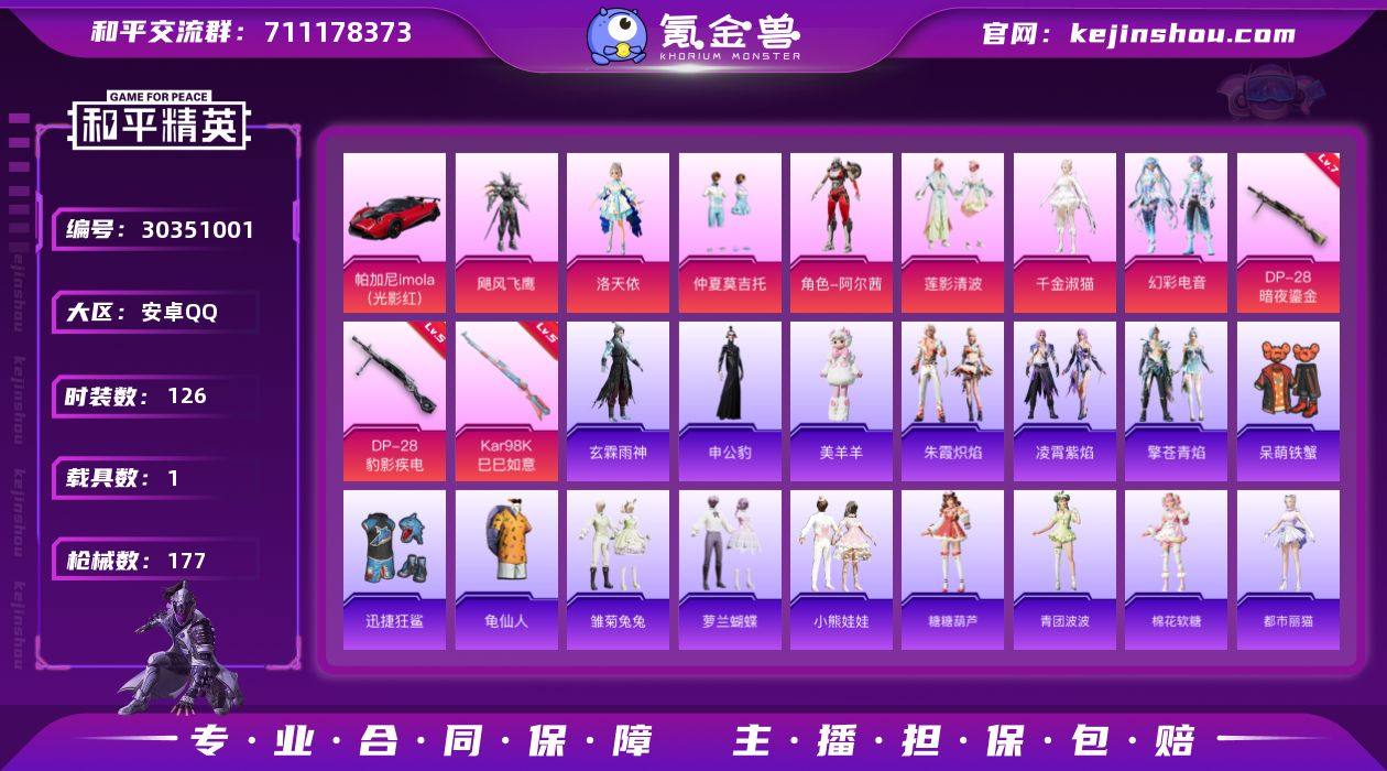 安卓 手Q-7粉装-3特效枪-1载具-4粉色飞行器-57907热力值-15王牌印记-126套装-177枪皮 【热门品类】:套装-龟仙人 【粉色套装】:粉装-飓风飞鹰,角色-洛天依,粉装-仲夏莫吉托,角色-阿尔茜,粉装-莲影清波,角色-千金淑猫,粉装-幻彩电音 【粉色枪皮等级】:Kar98K-巳巳如意(五级),DP-28-暗夜鎏金(七级),DP-28-豹影疾电(五级) 【粉色载具】:帕加尼imola(光影红) 【粉色枪皮】:Kar98K-巳巳如意,DP-28-暗夜鎏金,DP-28-豹影疾电 【粉色飞行器】:圣光天使飞行器,黄族统领飞行器,镜域双华-灵镜之阶 【粉色降落伞】:星之信仰降落伞,洛神天依降落伞,暗夜鎏金降落伞,闲梦青缨降落伞,圣堂之誓降落伞,沙丘之主降落伞,江南烟雨降落伞,金丰海韵降落伞,千金淑猫降落伞,月影灵韵降落伞,樱桃泡泡降落伞,幻彩电音降落伞,喜羊羊与灰太狼降落伞,极意拳锋降落伞,炫彩糖果降落伞 【稀有套装】:套装-龟仙人,套装-雪国风尚,套装-雏菊兔兔,套装-萝兰蝴蝶,套装-小熊娃娃,套装-糖糖葫芦,套装-青团波波,套装-棉花软糖,角色-都市丽猫,角色-怀庆长公主,角色-俏兔智灵,套装-燕燕于飞,套装-鱼渊荷华,套装-粉恋花,套装-紫幽梦,套装-蓝冰羽,角色-猎影月神,套装-彩虹兔,套装-云朵鹅,套装-雪绒豹,角色-绛羽幽主,套装-朱霞炽焰,套装-凌霄紫焰,套装-擎苍青焰,玩偶服-美羊羊,角色-申公豹,角色-玄霖雨神,套装-炫彩糖果 【稀有枪皮】:AUG-冰晶雪宝,AKM-星之信仰,AKM-破晓战魂,AKM-霓虹街区,AKM-龙的传人,M16A4-千金淑猫,SCAR-L-银碳小老虎,M416-糯团青竹,GROZA-懵萌河马,GROZA-田园牧歌,AUG-天降萌叽,QBZ-洛神天依,M762-天降萌叽,M762-暗夜鎏金,M762-云朵鹅,Mk47-妙红点点,Mk47-洛神天依,G36C-镜域双华,G36C-懵萌河马,G36C-暗夜玫瑰,AC-VAL-快闪甜心,蜜獾-天降萌叽,Famas-...