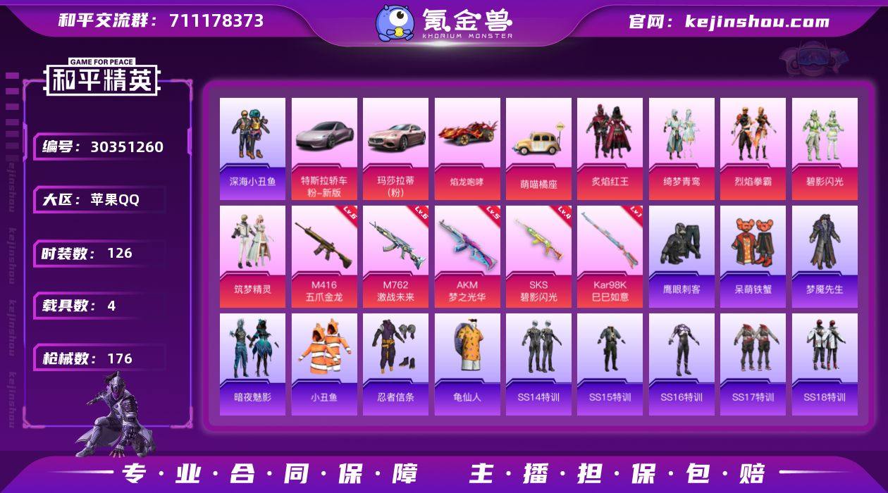 苹果 手Q-5粉装-5特效枪-4载具-0粉色飞行器-63143热力值-2王牌印记-126套装-176枪皮 【热门品类】:套装-深海小丑鱼,套装-小丑鱼,套装-忍者信条,套装-龟仙人 【粉色套装】:粉装-炙焰红王,粉装-绮梦青鸾,粉装-烈焰拳霸,粉装-碧影闪光,粉装-筑梦精灵 【粉色枪皮等级】:AKM-梦之光华(五级),M416-五爪金龙(六级),M762-激战未来(六级),Kar98K-巳巳如意(一级),SKS-碧影闪光(四级) 【粉色载具】:特斯拉Roadster(沁心粉),玛莎拉蒂Ghibli(粉),焰龙咆哮,萌喵橘座 【粉色枪皮】:AKM-梦之光华,M416-五爪金龙,M762-激战未来,Kar98K-巳巳如意,SKS-碧影闪光 【粉色降落伞】:幻影战神降落伞,至尊龙雀降落伞,香水柠檬降落伞,王牌四分卫降落伞,怪笑疯兔降落伞,葫芦兄弟降落伞,暗夜玫瑰降落伞,海渊国主降落伞,碧影闪光降落伞,恐龙拽拽降落伞,冷魅冰骑降落伞,筑梦精灵降落伞,炙焰牛王降落伞,旋转彩虹降落伞 【稀有套装】:套装-龟仙人 【稀有枪皮】:AKM-夜灯,AKM-彩虹符号,AKM-恐龙拽拽,AKM-灼热熔岩,AKM-生命誓言,AKM-百万伏特,AKM-筑梦精灵,AKM-萌趣颜团子,AKM-虎虎生威,AKM-霓虹街区,M16A4-夜灯,M16A4-幻世战舞者,M16A4-甜心亚梦,SCAR-L-暗夜玫瑰,SCAR-L-炫彩节奏,SCAR-L-玉兔迎春,SCAR-L-碧影闪光,M416-夜灯,M416-滑板小狐,M416-糯团青竹,GROZA-异彩先驱,GROZA-恐龙拽拽,GROZA-懵萌河马,GROZA-治愈之星,GROZA-田园牧歌,AUG-幻影战神,AUG-焰龙焚天,AUG-耀粉歌者,AUG-青春冒险家,QBZ-彩虹符号,QBZ-洛神天依,QBZ-电玩视界,QBZ-飞驰魅影,M762-天降萌叽,M762-橘柚倾心,M762-深海曼妙,M762-瑞龙福将,Mk47-洛神天依,Mk47-百万伏特,Mk47-青春冒险家,G36C-懵萌河马,G36C-时空追击者,AC-VAL-天降萌叽,AC-VAL-甜心亚梦,蜜獾-娇憨猪猪,UZI-啾咪啾咪,U...