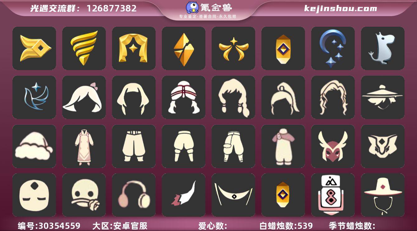 [17187709]安卓官服 邮箱账号 3珍稀物品 7毕业季 6毕业图 23蜡烛 【珍稀物品】白枭(帝企鹅发),阿努比斯(狗头),玫瑰花 【季节已毕业】预言季,集结季,小王子季(王子季),表演季,夜行季,九色鹿(九色鹿季),彩染季 【完成地图】晨岛,云野,雨林,霞谷,墓土(暮土),禁阁 【礼包】青衫落拓礼包,爱心眼镜,绊爱(绊爱斗篷)(绊爱礼包),橘子(大橘大利),心心相印发饰礼包,新年耳钉(金鳞耳饰),彩虹耳钉(彩虹耳饰),日光耳环,鹿角(圣诞鹿角),创始人(创始人斗篷),福娃(福娃礼包)(春之日礼包)(铜钱斗),蝙蝠套(蝙蝠斗篷)(南瓜头),白绒金(白雪斗篷),献瑞折扇礼包,秋千(情人秋千),茶桌(花憩茶桌),小狐狸(狐狸背包),小狗周年发饰(小狗周年头饰) 【裤子】飞天裤(柔缎花边连)(九色鹿丝带裤),王子服(小王子套装),武士裤,背带裤,搓澡巾 【面具】黄眉企鹅面具,夜行毕业面具(棕熊面具),贴花面具(丛林黑面具),辉光羚羊面具,阿努比斯 【面饰】红耳机 【发型】小王子发型,飞天盘发(九色鹿丸子头),虚荣,若笠(箬笠) 【头饰】平顶帽,蓝色音乐会(蓝色音乐符),行军锅头盔(六边锅帽子)(双耳锅帽子) 【斗篷】燕尾斗篷,黄色连帽披风(连帽斗篷)(斜边队长斗篷),粉红绒毛斗篷(绒毛斗篷),彩染围巾斗篷,绿芽,海洋斗 【配饰】圆鼓(手拍大鼓),玫瑰花,雨伞,高音钢琴(白色高脚钢琴)