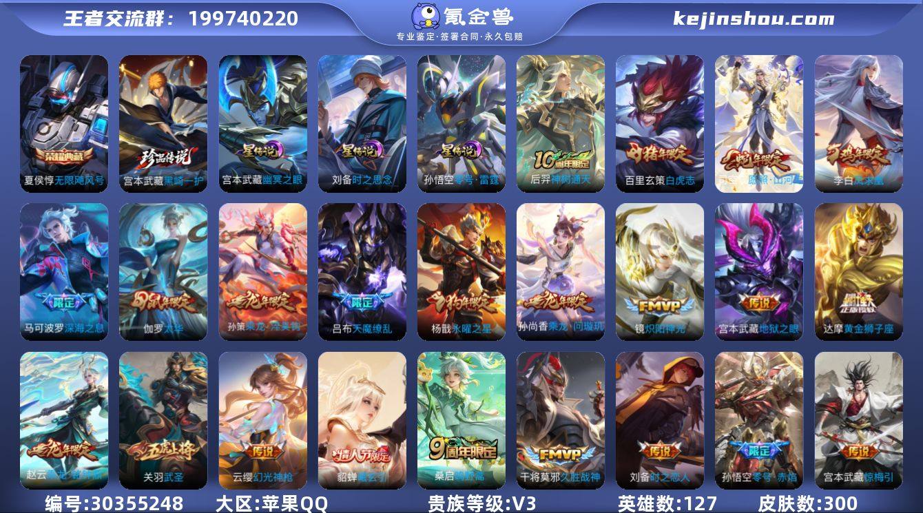 贵族等级:V3 典藏皮肤数:1 珍品无双皮肤数:0 无双皮肤数:0 珍品传说皮肤数:1 传说皮肤数:27 史诗皮肤数:86 皮肤数:300 英雄数:127 段位:至圣王者