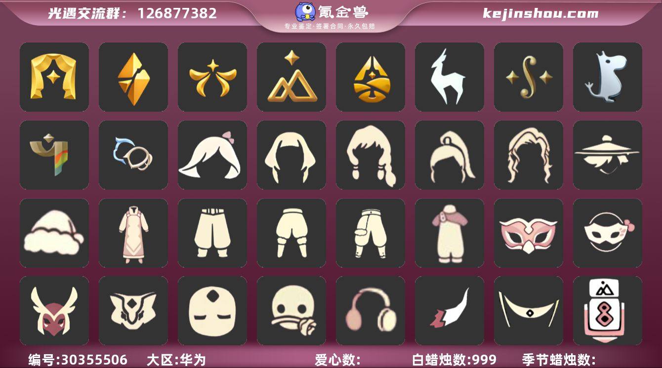 账号类型: 手机账号 季节已毕业: 小王子季,风行季,潜海季,表演季,破晓季,欧若拉季,集结季,夜行季,追忆季,拾光季,归巢季,九色鹿季,筑巢季,二重奏季,姆明季,彩染季,青鸟季 完成地图: 晨岛,云野,雨林,霞谷,暮土,禁阁 珍稀物品: 白枭,透明蝶翼斗,玫瑰花,彩虹围巾 礼包: 吉他,橘子,兔子 裤子: 武士裤,背带裤,搓澡巾,击剑裤,妮妮裙子,王子服,蓝绿裤,飞天裤,筑巢季·裤子,青鸟尊贵蓬头裤子 面具: 凤凰面具,贴花面具,呼吸面具,夜行毕业面具,黄眉企鹅面具,辉光羚羊面具 面饰: 红耳机,黑框眼镜,青鸟毕业面饰 项链: 围巾 发型: 归巢毕业发型,若笠,虚荣,单侧绑发,小王子发型,留辫蘑菇头,飞天盘发 头饰: 行军锅头盔,羽毛发饰,牛仔帽,平顶帽 斗篷: 海洋斗,绿芽,粉红绒毛斗篷,遥鲲斗篷,黄色连帽披风,燕尾斗篷,冥龙斗篷,彩染围巾斗篷,青鸟毕业斗篷 配饰: 雨伞,筑巢季·小手办,高音钢琴,姆明抱枕,小红伞,相机,玫瑰花,二重奏挂画,圆鼓,蓝色手碟,鲲灯 亮点: 【优质装备】:表演季,白枭(帝企鹅发),武士裤,小王子季(王子季),风行季,潜海季,破晓季,透明蝶翼斗,欧若拉季(欧若拉),归巢毕业发型(五塑彩羽发),行军锅头盔(六边锅帽子)(双耳锅帽子),羽毛发饰(多羽发饰),筑巢季·小手办(光之子试衣),高音钢琴(白色高脚钢琴),集结季,玫瑰花,夜行季,追忆季,妮妮裙子(妮妮长裙),牛仔帽(西部帽),姆明抱枕,小红伞(姆明红伞)(姆明大伞),相机(季卡相机),拾光季,彩虹围巾(五塑彩带斗),归巢季,九色鹿(九色鹿季),王子服(小王子套装),蓝绿裤(高领舞服),晨岛,云野,雨林,霞谷,墓土(暮土),禁阁,若笠(箬笠),青鸟尊贵蓬头裤子(蓝色燕尾服),飞天裤(柔缎花边连)(九色鹿丝带裤),围巾(肩带),筑巢季,二重奏季,二重奏挂画(合奏挂画),姆明季,筑巢季·裤子(设计师长袍),凤凰面具,贴花面具(丛林黑面具),呼吸面具(潜水面具),夜行毕业面具(棕熊面具),黄眉企鹅面具,黑框眼镜(粗框...