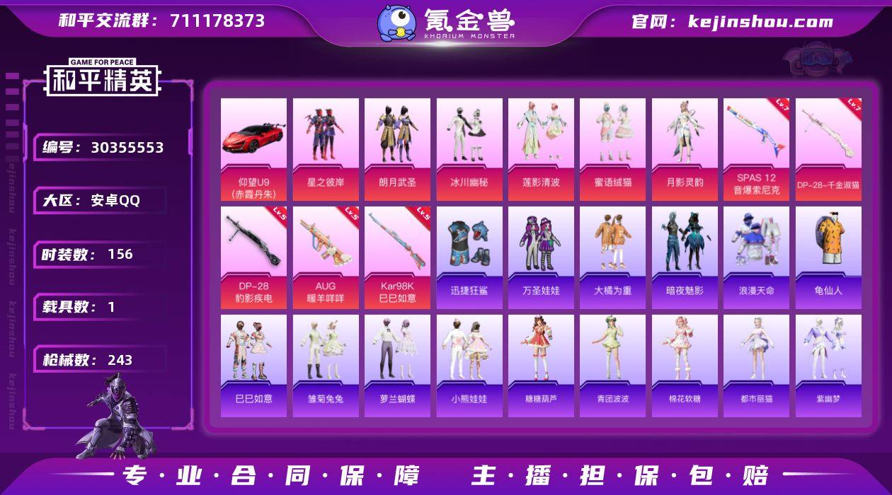 安卓 手Q-6粉装-5特效枪-1载具-68477热力值-7印记-156套装-243枪皮 【热门品类】:套装-浪漫天命,套装-龟仙人,M416-星际漫游 【粉色套装】:粉装-星之彼岸,粉装-朗月武圣,粉装-冰川幽秘,粉装-莲影清波,粉装-蜜语绒猫,角色-月影灵韵 【粉色枪皮等级】:AUG-暖羊咩咩(五级AUG-暖羊咩咩),Kar98K-巳巳如意(五级Kar98K-巳巳如意),SPAS-12-音爆索尼克(七级SPAS-12-音爆索尼克),DP-28-千金淑猫(七级DP-28-千金淑猫),DP-28-豹影疾电(五级DP-28-豹影疾电) 【粉色载具】:仰望U9(赤霞丹朱) 【粉色枪皮】:AUG-暖羊咩咩,Kar98K-巳巳如意,SPAS-12-音爆索尼克,DP-28-千金淑猫,DP-28-豹影疾电 【粉色飞行器】:歌者泠鸢飞行器,极意拳锋飞行器 【粉色降落伞】:百万伏特降落伞,甜心宝贝降落伞,王牌四分卫降落伞,妙趣可丽降落伞,冰川粉黛降落伞,莲影清波降落伞,精灵梦叶罗丽降落伞,金丰海韵降落伞,千金淑猫降落伞,炫彩糖果降落伞 【稀有套装】:套装-龟仙人,套装-巳巳如意,套装-雏菊兔兔,套装-萝兰蝴蝶,套装-小熊娃娃,套装-糖糖葫芦,套装-青团波波,套装-棉花软糖,角色-都市丽猫,套装-紫幽梦,套装-蓝冰羽,角色-瑰梦爱神,套装-云朵鹅,套装-雪绒豹,套装-蓝海鲸歌,套装-炫彩糖果 【稀有枪皮】:AUG-冰晶雪宝,AKM-夜灯,AKM-彩虹符号,AKM-影袭,AKM-星之彼岸,AKM-萌趣颜团子,AKM-虎虎生威,AKM-龙的传人,M16A4-星际漫游,M16A4-红色方程式,SCAR-L-夜灯,SCAR-L-幽秘魅影,SCAR-L-红色方程式,SCAR-L-黄金龙骨,SCAR-L-冷漠罗丽,M416-摩登王国,M416-星际漫游,M416-滑板小狐,M416-糯团青竹,M416-蓝色火焰,GROZA-彩虹符号,GROZA-懵萌河马,GROZA-治愈之星,GROZA-田园牧歌,AUG-圣光天使,AUG-耀粉歌者,AUG-青春冒险家,AUG-黑白懵懵牛,QBZ-彩虹符号,QBZ-电玩视界,QBZ-神秘黑...