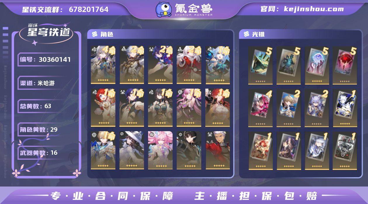 男主,开拓等级 70,黄数 83,29个五星角色,16个五星光锥 ,126个星穹,0张星轨专票,0张星轨通票,22个四星角色号