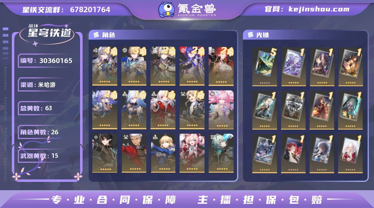 【崩坏·星穹铁道】冒险等级:70,女主,五星数量:41,五星角色:布洛妮娅 * 4命,杰帕德 * 3命,白露 * 2命,姬子 * 2命,黄泉 * 2命,流萤 * 2命,彦卿 * 1命,克拉拉 * 1命,镜流 * 1命,银狼,希儿,灵砂,大黑塔,忘归人,罗刹,遐蝶,藿藿,真理医生,花火,那刻夏,风堇,知更鸟,Saber,Archer,丹恒·腾荒,昔涟__五星光锥:星海巡航 * 5精,记一位星神的陨落,银河铁道之夜,无可取代的东西,时节不居,如泥酣眠,但战斗还未结束,唯有香如故,向着不可追问处,让告别,更美一些,此身为剑,惊魂夜,游戏尘寰,行于流逝的岸,梦应归于何处__四星角色:阿兰 * 6命,娜塔莎 * 6命,虎克 * 6命,貊泽 * 6命,黑塔 * 6命,丹恒 * 6命,艾丝妲 * 6命,希露瓦 * 6命,停云 * 6命,桑博 * 6命,三月七 * 6命,青雀 * 6命,佩拉 * 6命,驭空 * 6命,卢卡 * 6命,玲可 * 6命,雪衣 * 6命,米沙 * 6命,加拉赫 * 6命,素裳 * 4命,桂乃芬 * 4命,寒鸦 * 4命