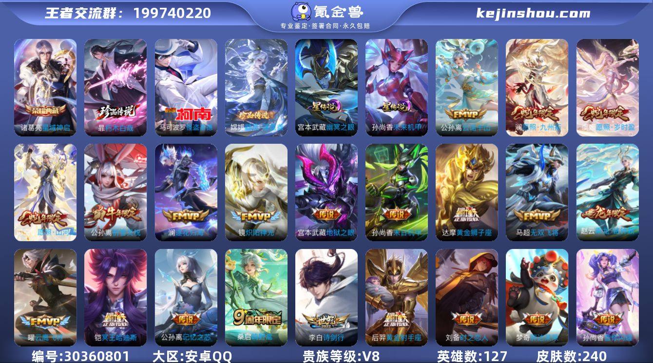 贵族等级:V8 典藏皮肤数:1 珍品无双皮肤数:0 无双皮肤数:0 珍品传说皮肤数:3 传说皮肤数:27 史诗皮肤数:69 皮肤数:240 英雄数:127 段位:荣耀王者 卖家说:澜全皮。公孙离差一个全皮。50星
