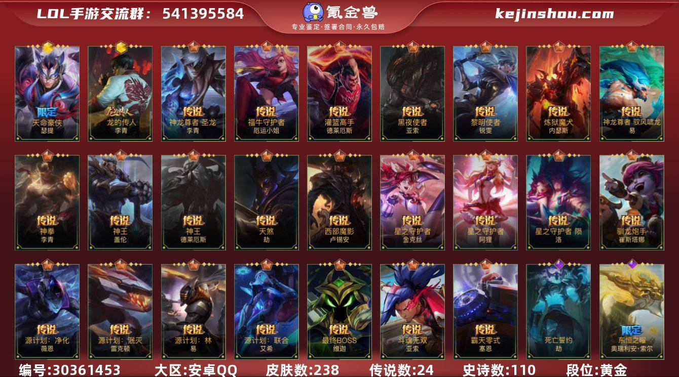 皮肤数:238 典藏皮肤数量:0 神话皮肤数量:2 传说皮肤数量:24 史诗皮肤数量:110 段位:黄金 卖家说:还有最新战利品盲僧皮肤