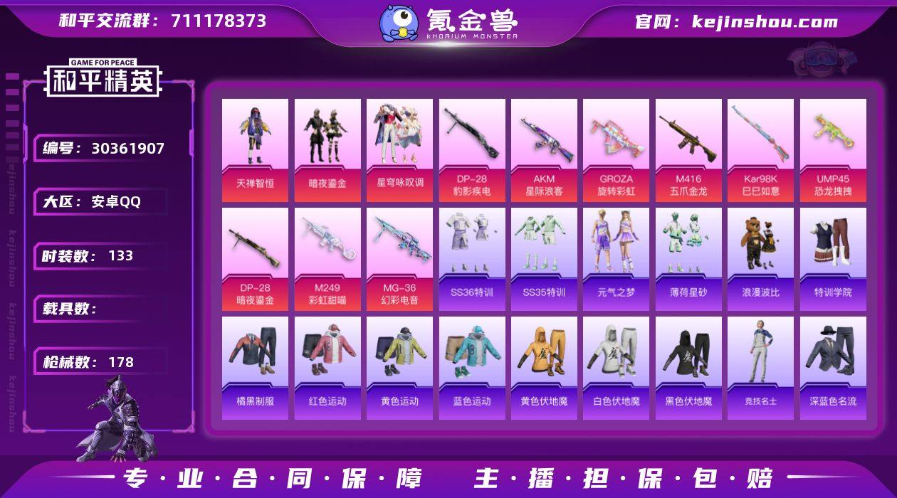 【0载具 9特效枪 3粉装 178枪皮 133套装】3印记/5.5万热力值/57级收藏家/有老六服/套装-浪漫天命,套装-狂沙舞者,套装-雪山精英,套装-金耀舞者,套装-暗影哥特,套装-浪漫波比,套装-天禅智恒,角色-军刀雅典娜,套装-暗夜鎏金,套装-星穹咏叹调/9升级枪:AKM-星际浪客,GROZA-旋转彩虹,M416-五爪金龙,Kar98K-巳巳如意,UMP45-恐龙拽拽,DP-28-豹影疾电,DP-28-暗夜鎏金,M249-彩虹甜喵,MG-36-幻彩电音/2飞行器:炫彩糖果飞行器,异域银装飞行器156895610x,编号:LYYMW20