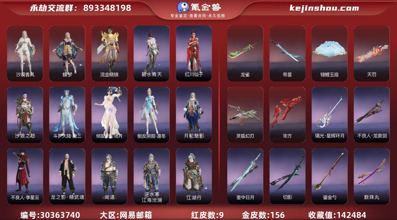 红皮数:9 黄皮数:156 收藏值:142484 等级:199 三排段位:黄金 通行证:未升级 沙漠香风,蝶梦,流金晓锦 龙雀,帝星,锦鲤玉扇,天罚,灵狐幻刃,毕方 卖家说:极品带妹号,火男冰女