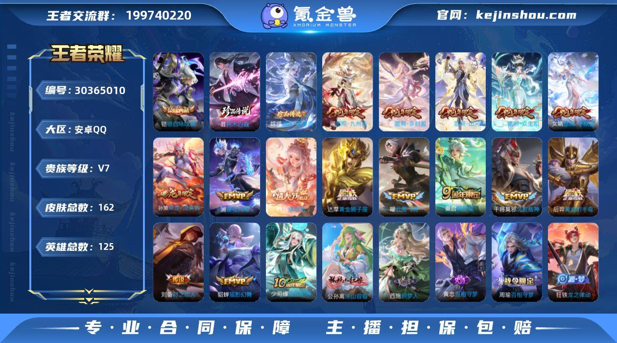 AL646094 【万战公孙离,嫦娥,16传说2珍品传说】 皮肤数162 皮肤价值133756 传说皮肤数16 珍品传说皮数2 史诗皮肤数50 英雄数125 营地id1711402582 贵族等级【文本】贵族7级 【贵族7级】 【可排位】 【是】 荣耀典藏1 珍品传说2 内测皮肤1 年限皮肤8 限定皮肤54 赛季限定11 史诗皮肤51 战令限定11 勇者皮肤71 其他皮肤20 荣耀典藏:铠银白咏叹调; 珍品传说:暃朽木白哉,嫦娥器灵落星盏; 内测皮肤:高渐离玩趣恶龙; 年限皮肤:女娲愿照千秋盛,妲己愿照众生和,司空震愿照山河定,马可波罗山海玄木吟,虞姬愿照岁时盈,澜愿照九州拓,孙策乘龙淬吴钩,典韦岱宗; 限定皮肤:曹操逐霄之志,少司缘巫礼祀神,百里玄策原初追逐者,桑启鸣野蒿,西施织梦人,公孙离涂山容容,戈娅驭风魔法,鬼谷子克喵,元歌云间偶戏,高渐离玩趣恶龙,高渐离死亡摇滚,白起死霸装,扁鹊灵蛊蚀心,暃朽木白哉,马可波罗妄想实况,姬小满小满鸭,狂铁龙之律动,苏烈春野闲踪,钟馗虚灵犬护,阿轲化蝶舞,嫦娥器灵落星盏,高渐离燃音魔法,西施续相思,女娲愿照千秋盛,妲己愿照众生和,司空震愿照山河定,马可波罗山海玄木吟,孙膑茶境仙,马超访茗客,虞姬愿照岁时盈,赵怀真器灵浮梦炉,狄仁杰鹰眼统帅,太乙真人谧流熔炉,澜愿照九州拓,庄周高山流水,孙策乘龙淬吴钩,狄仁杰阴阳师,沈梦溪龙舞盛年,鬼谷子天穹祈灯,司空震地狱燃心,狄仁杰魔术师,艾琳流音漫舞,阿古朵江河有灵,张良古海寻踪,鲁班大师探海日志,裴擒虎擒涛扼浪,桑启海盐诗旅,元歌无心,上官婉儿神器万象笔,赵云皇家上将,典韦岱宗,孙悟空孙行者,李元芳云中旅人,项羽海滩派对; 赛季限定:百里玄策原初追逐者,亚瑟荣光之誓,甄姬逆浪荇歌,钟馗虚灵犬护,太乙真人谧流熔炉,鬼谷子天穹祈灯,张良古海寻踪,鲁班大师探海日志,裴擒虎擒涛扼浪,桑启海盐...
