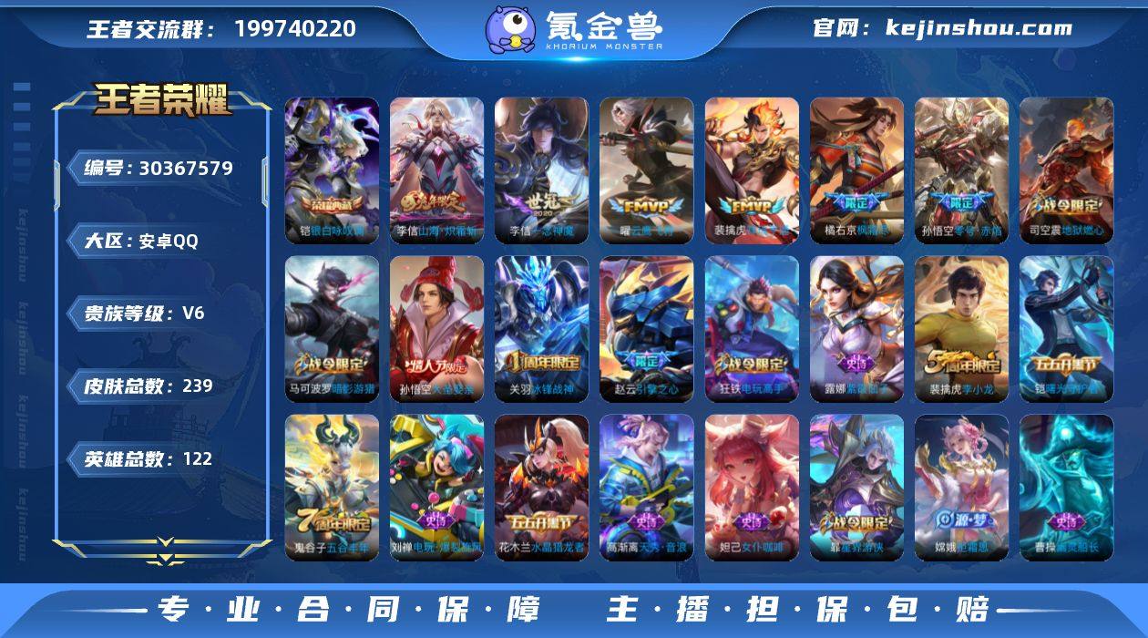 【商品标题】:安卓Q-V6-至尊星耀IV段位-122英雄-239皮肤-1典藏-0无双-0珍品传说-7传说-59史诗 【荣耀典藏】:铠银白咏叹调 【内测皮肤】:孙尚香蔷薇恋人,狂铁特工战影,干将莫邪胡桃夹子 【传说皮肤】:李信一念神魔,曜云鹰飞将,孙悟空零号赤焰,橘右京枫霜尽,李信山海炽霜斩,裴擒虎祥瑞亨通,司空震愿照山河定 【限定皮肤】:姜子牙天穹之誓,狄仁杰阴阳师,赵云皇家上将,赵云引擎之心,编号:ZRJHV89