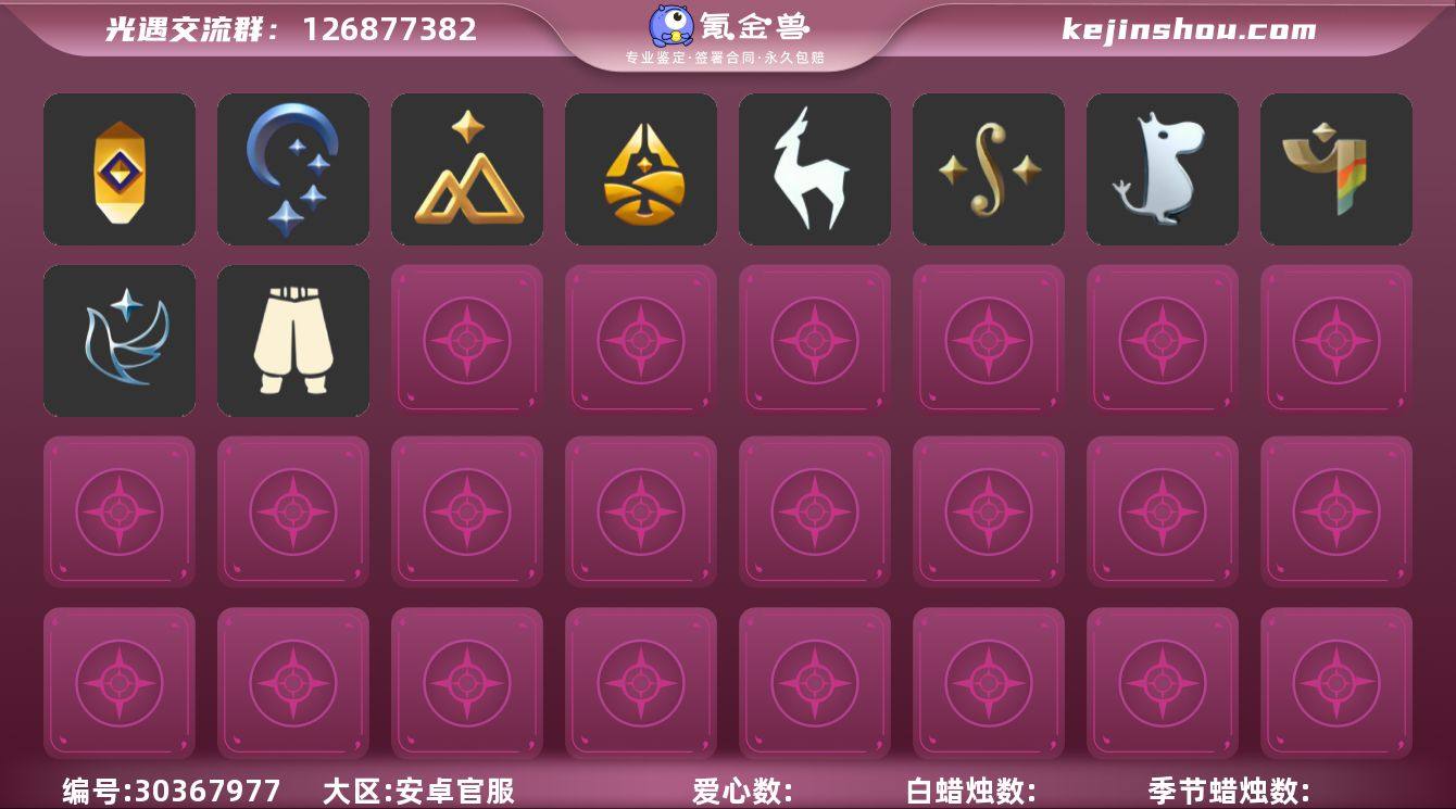 账号类型: 手机账号 季节已毕业: 潜海季,表演季,破晓季,欧若拉季,夜行季,追忆季,拾光季,归巢季,九色鹿季,筑巢季,二重奏季,姆明季,彩染季,青鸟季 完成地图: 晨岛,云野,雨林,霞谷,暮土,禁阁 珍稀物品: 白枭,透明蝶翼斗,彩虹围巾 礼包: 蝙蝠套,巫师,绊爱,鹿角,茶桌,橘子,兔子,向日葵套,透明蛛丝,献瑞折扇礼包 裤子: 武士裤,背带裤,搓澡巾,妮妮裙子,蓝绿裤,飞天裤,筑巢季·裤子,青鸟尊贵蓬头裤子 面具: 呼吸面具,夜行毕业面具,黄眉企鹅面具,辉光羚羊面具 面饰: 红耳机,黑框眼镜,青鸟毕业面饰 项链: 围巾 发型: 归巢毕业发型,若笠,虚荣,单侧绑发,留辫蘑菇头,飞天盘发 头饰: 牛仔帽 斗篷: 绿芽,粉红绒毛斗篷,遥鲲斗篷,燕尾斗篷,冥龙斗篷,彩染围巾斗篷,青鸟毕业斗篷 配饰: 雨伞,筑巢季·小手办,高音钢琴,姆明抱枕,小红伞,相机,二重奏挂画,鲲灯 亮点: 【优质装备】:表演季,白枭(帝企鹅发),武士裤,潜海季,破晓季,透明蝶翼斗,欧若拉季(欧若拉),归巢毕业发型(五塑彩羽发),筑巢季·小手办(光之子试衣),高音钢琴(白色高脚钢琴),夜行季,追忆季,妮妮裙子(妮妮长裙),牛仔帽(西部帽),姆明抱枕,小红伞(姆明红伞)(姆明大伞),相机(季卡相机),拾光季,彩虹围巾(五塑彩带斗),归巢季,九色鹿(九色鹿季),蓝绿裤(高领舞服),飞天裤(柔缎花边连)(九色鹿丝带裤),围巾(肩带),筑巢季,红耳机,晨岛,云野,雨林,霞谷,墓土(暮土),禁阁,若笠(箬笠),青鸟尊贵蓬头裤子(蓝色燕尾服),二重奏季,二重奏挂画(合奏挂画),姆明季,筑巢季·裤子(设计师长袍),呼吸面具(潜水面具),夜行毕业面具(棕熊面具),黄眉企鹅面具,黑框眼镜(粗框眼镜),单侧绑发(单边小辫),留辫蘑菇头,粉红绒毛斗篷(绒毛斗篷),遥鲲斗篷(双翼遥鲲斗),燕尾斗篷,冥龙斗篷,鲲灯(追忆之书),辉光羚羊面具,彩染季,飞天盘发(九色鹿丸子头),青鸟季,青鸟毕业面饰(青鸟面饰),青鸟毕业斗篷(青鸟斗篷),蝙蝠套(蝙蝠斗...