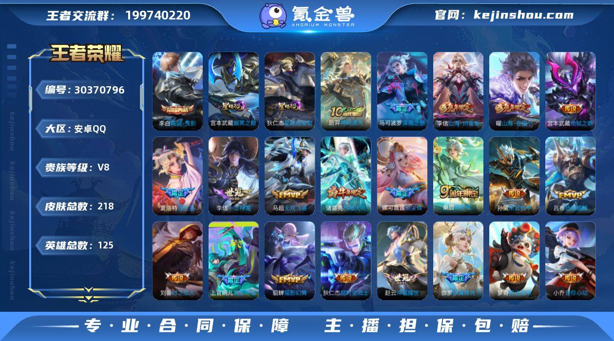 【V8 1典藏 2星传说 27传说 218皮肤 125英雄】10印记/1金标:赵云/3市标:娜可露露,孙悟空,鬼谷子/1典藏:鸣剑·曳影/27传说:深海之息,山海·苍雷引,一念神魔,山海·炽霜斩,胖达荣荣,时雨天司,无双飞将,淬星耀世,猫影幻舞,音你闪耀,电玩·雷克斯,怒海麟威,地狱之眼,超时空战士(狄仁杰),飞鸢探春,前尘镜,时之恋人(刘备),浮生妄,音你心动(周瑜),音你心动(小乔),启明星使,炽翼辉光,末日机甲(孙策),绛天战甲,妄想奇谈,鸣野蒿,神树通天/65史诗:遇见神鹿,猫狗日记(孙策),电玩高手,唐三藏,李小龙,玄武志,特工魅影,五谷丰年,猫狗日记(大乔),修罗,山海·玄木吟,冰冠公主,黎明之约,乘风破浪,皇家上将,引擎之心,女仆咖啡,魅力维加斯,超时空战士(钟无艳),心灵骇客,功夫厨神,圣诞恋歌,摇滚巨星,紫霞仙子,驭风魔法,冰雪圆舞曲,水果甜心,时之恋人(孙尚香153428598x,编号:LYWMM95