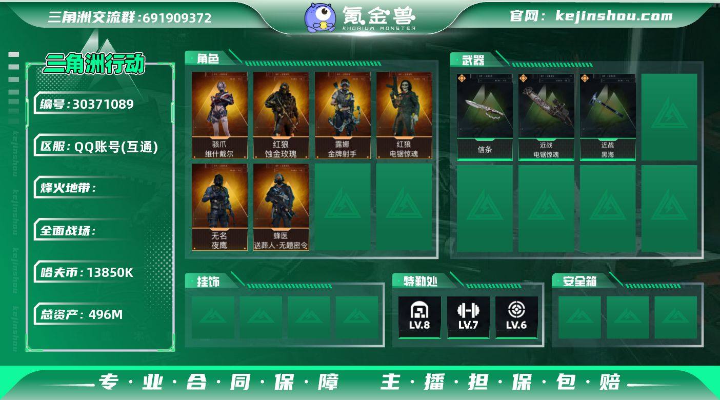 S633总资产496M,哈夫币1385w,近战4 枪皮数量216,骇爪-维什戴尔/红狼-蚀金玫瑰/露娜-金牌射手/红狼-电锯惊魂/深蓝-不破誓约/无名-夜鹰/蜂医-送葬人无题密令,近战-信条/近战-黑海/近战-电锯惊魂,战场等级1军士长, 行动等级60黑鹰,安全箱等时效性道具请以游戏内数据为准,详情请看图