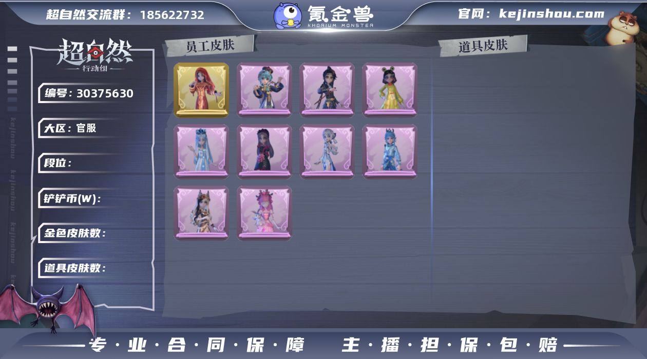 DJ503⭐】超自然传说 【幻梦皮肤数量】0 【金色皮肤数量】1 【紫色皮肤数量】3 【道具皮肤数量】7 【铲铲币】594w 【累充】3030金砖 【赛季魔盒】普通魔盒 【员工】小黄、爱丽丝、零、阿念、逍遥、薇薇安、巫铃儿、莉莉、艾伦、爱德华、兰 【金色皮肤】小黄-遗失的童话 【紫色皮肤】莉莉-除妖小师妹、爱丽丝-丝缕哀歌、小黄-呱呱雨衣 【道具皮肤】急救包-蔷薇物语、转轮手枪-新星时代、腰包-月下莲台、音响-鸣沙鼓、摸金符-紫霄、背饰-云梦之星、背饰-蝶恋花 【头饰】惊魂南瓜头套、鱼头怪头套、烈焰红唇头套、大葱明头套、火爆了头套、面具马头套、哈士奇头套、萨卡班甲鱼头套、嘻嘻头套、滑稽头套、呆滞头套、卑微头套、鳄霸天头套、龙傲天头套、驼半仙头套、小狗蛇点点头套、粽小宝头套、像素朋克墨镜、后室幸存者头套 【挂饰】九色祥鹿、小鲨包包、天使消失的年代、钗头凤 【动作】luvaboy、心跳摇、舞台中心、青海摇、举牌、抬手