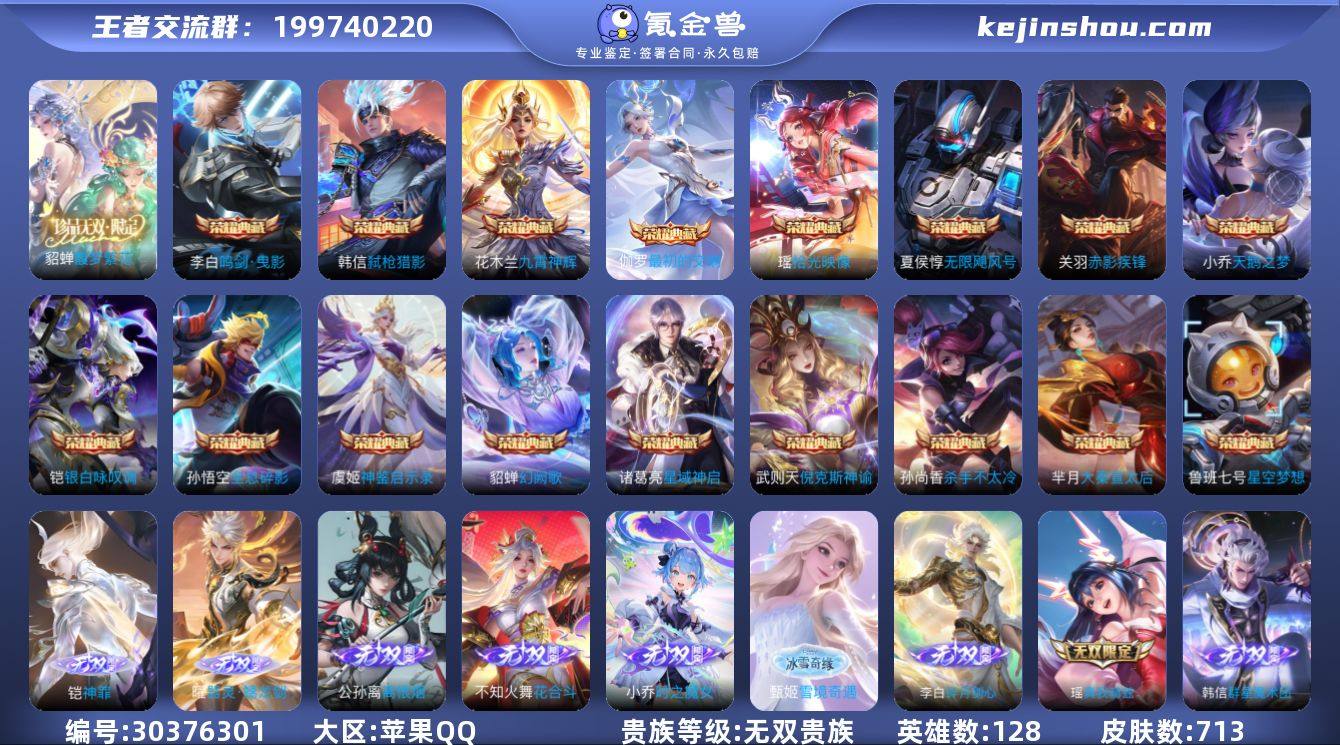 2个小国 2个小兵皮肤 打野号 苹果Q-V11-最强王者段位-128英雄-713皮肤-17典藏皮肤-1典藏英雄-1珍品无双-11无双-9珍品传说-129传说-249史诗 【英雄全皮】:小乔全皮,墨子全皮,妲己全皮,嬴政全皮,庄周全皮,高渐离全皮,阿轲全皮,扁鹊全皮,芈月全皮,吕布全皮,元歌全皮,曹操全皮,典韦全皮,宫本武藏全皮,李白全皮,马可波罗全皮,狄仁杰全皮,达摩全皮,武则天全皮,司马懿全皮,关羽全皮,貂蝉全皮,安琪拉全皮,露娜全皮,姜子牙全皮,刘邦全皮,韩信全皮,孙权全皮,王昭君全皮,花木兰全皮,不知火舞全皮,朵莉亚全皮,娜可露露全皮,橘右京全皮,孙悟空全皮,牛魔全皮,后羿全皮,刘备全皮,张飞全皮,李元芳全皮,杨玉环全皮,苍全皮,女娲全皮,鬼谷子全皮,大乔全皮,黄忠全皮,铠全皮,百里玄策全皮,百里守约全皮,弈星全皮,公孙离全皮,沈梦溪全皮,明世隐全皮,狂铁全皮,米莱狄全皮,瑶全皮,云中君全皮,李信全皮,伽罗全皮,盾山全皮,孙策全皮,猪八戒全皮,亚连全皮,嫦娥全皮,马超全皮,海月全皮,曜全皮,西施全皮,蒙犽全皮,鲁班大师全皮,蒙恬全皮,澜全皮,盘古全皮,镜全皮,桑启全皮,夏洛特全皮,司空震全皮,云缨全皮,金蝉全皮,暃全皮,赵怀真全皮,莱西奥全皮,戈娅全皮,空空儿全皮,影全皮,海诺全皮,少司缘全皮 【荣耀典藏】:武则天英雄,孙悟空全息碎影,武则天倪克斯神谕,夏侯惇无限飓风号,小乔天鹅之梦,孙尚香杀手不太冷,鲁班七号星空梦想,芈月大秦宣太后,李白鸣剑曳影,诸葛亮星域神启,花木兰九霄神辉,关羽赤影疾锋,铠银白咏叹调,貂蝉幻阙歌,韩信弑枪猎影,虞姬神鉴启示录,瑶拾光映像,伽罗最初的交响 【珍品无双】:貂蝉馥梦繁花 【无双皮肤】:武则天神器明辉仪,妲己青丘九尾,瑶真我赫兹,李白碎月剑心,小乔时之魔女,韩信群星魔术团,不知火...